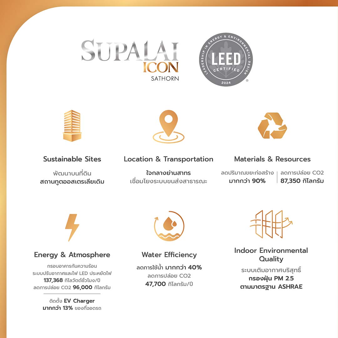 ดร.ประทีป ตั้งมติธรรม ประธานกรรมการบริหาร บริษัท ศุภาลัย จำกัด (มหาชน) กล่าวว่า “บริษัทฯ มุ่งพัฒนาโครงการที่อยู่อาศัยที่เป็นมิตรต่อสิ่งแวดล้อม เพื่อร่วมเป็นส่วนหนึ่งในการดูแลสิ่งแวดล้อม ซึ่งถือเป็นหนึ่งในกลยุทธ์ของ การดำเนินธุรกิจอย่างยั่งยืน โดยตั้งเป้าลดการปล่อยก๊าซเรือนกระจกร้อยละ 40 ภายในปี 2573 จาก BAU (Business As Usual) สำหรับโครงการศุภาลัย ไอคอน สาทร เป็นหนึ่งในโครงการมาสเตอร์พีซของศุภาลัย ที่โดดเด่นด้วยแนวคิดรักษ์โลก “Green Building @ Sathorn” ให้ความสำคัญตั้งแต่การออกแบบ อาคารที่ช่วยประหยัดพลังงาน การเลือกใช้วัสดุ Green Product และการเลือกคู่ค้าที่ใส่ใจกระบวนการผลิตที่ยั่งยืน รวมถึงการพัฒนานวัตกรรมและเทคโนโลยีในการก่อสร้าง การบริหารจัดการของเสีย อย่างมีประสิทธิภาพ และการเพิ่มพื้นที่สีเขียวภายในโครงการ นอกจากนี้ การได้รับการรับรองมาตรฐานอาคารเขียว LEED สำหรับอาคารสำนักงาน ยังสะท้อนถึงความมุ่งมั่นของศุภาลัยในการสร้างสรรค์อาคารที่เป็นมิตรต่อสิ่งแวดล้อม เพื่อยกระดับมาตรฐานที่อยู่อาศัยรักษ์โลก ตอบโจทย์ความต้องการของผู้ใช้งาน และความยั่งยืนของสิ่งแวดล้อม”