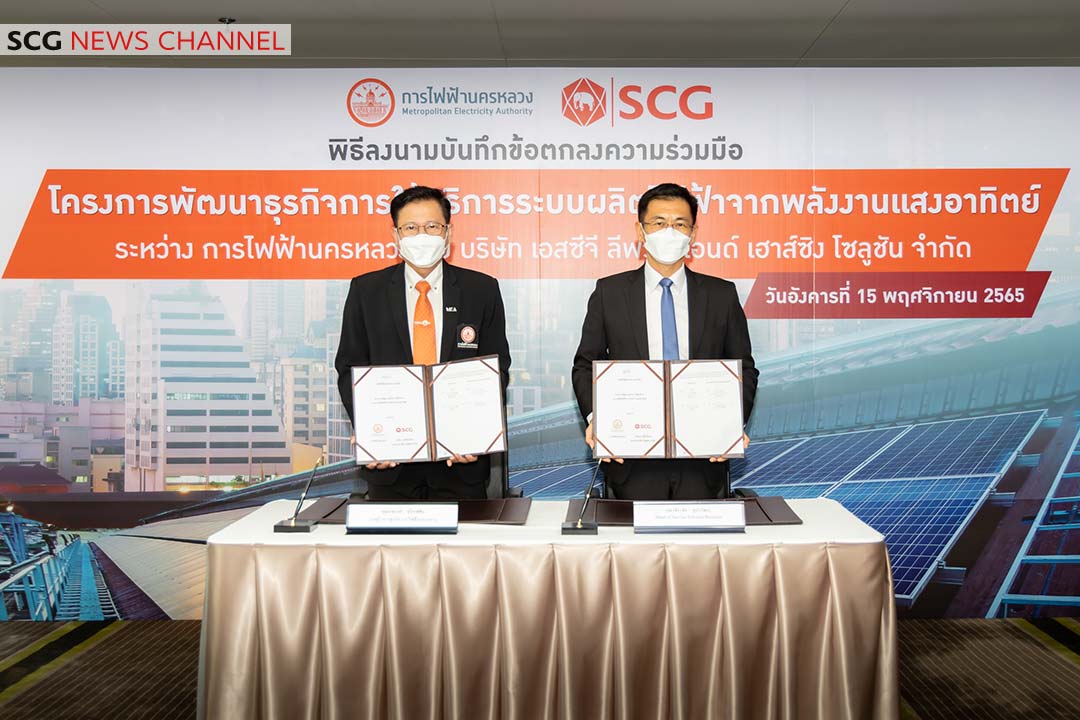 วันที่15 พฤศจิกายน 2565 นายนิธิ ภัทรโชค กรรมการผู้จัดการใหญ่ ธุรกิจซีเมนต์และผลิตภัณฑ์ก่อสร้าง เอสซีจี พร้อมด้วย นายจาตุรงค์ สุริยาศศิน รองผู้ว่าการธุรกิจ การไฟฟ้านครหลวง ร่วมพิธีลงนามบันทึกข้อตกลงโครงการพัฒนาธุรกิจ การให้บริการระบบผลิตไฟฟ้าจากพลังงานแสงอาทิตย์ ระหว่าง บริษัท เอสซีจี ลีฟวิง แอนด์ เฮาส์ซิง โซลูชัน จำกัด กับ MEA หรือการไฟฟ้านครหลวง เพื่อพัฒนาและขยายตลาดการให้บริการ ระบบผลิตไฟฟ้าจากพลังงานแสงอาทิตย์ในกลุ่มบ้านพักอาศัย และกลุ่มอาคารขนาดใหญ่ ตลอดจนพัฒนารูปแบบธุรกิจ และบริการของโครงการให้เป็นไปตามความต้องการของตลาด โดยมี SCG และ MEA เป็นผู้ให้บริการ โดยมีนายวิโรจน์ รัตนชัยสิทธิ์ Vice President – Housing Products and Solution Business และนายวชิระชัย คูนำวัฒนา Head of Service Solution Business ร่วมงาน ณ โถงรับรอง สำนักงานใหญ่ บริษัท ปูนซิเมนต์ไทย จำกัด (มหาชน) สำนักงานใหญ่ บางซื่อ
