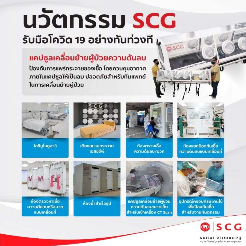 สำหรับเอสซีจี เชื่อในสิ่งนี้ และมีเทคโนโลยี มีนวัตกรรมที่จะช่วยแก้ปัญหาโควิดได้ โดยร่วมมือกับทีมบุคลากรทางการแพทย์ โรงพยาบาลต่าง ๆ พัฒนาและออกแบบนวัตกรรมที่รวดเร็ว ตรงกับความต้องการของสังคมและต้องทำงานแข่งกับเวลา ปัจจุบันเอสซีจีมีนวัตกรรมป้องกันโควิด-19 รวมกว่า 30 นวัตกรรม ที่ส่งมอบไปยังโรงพยาบาล หน่วยงาน และชุมชนต่าง ๆ แล้วกว่า 1,500 แห่งทั่วประเทศ