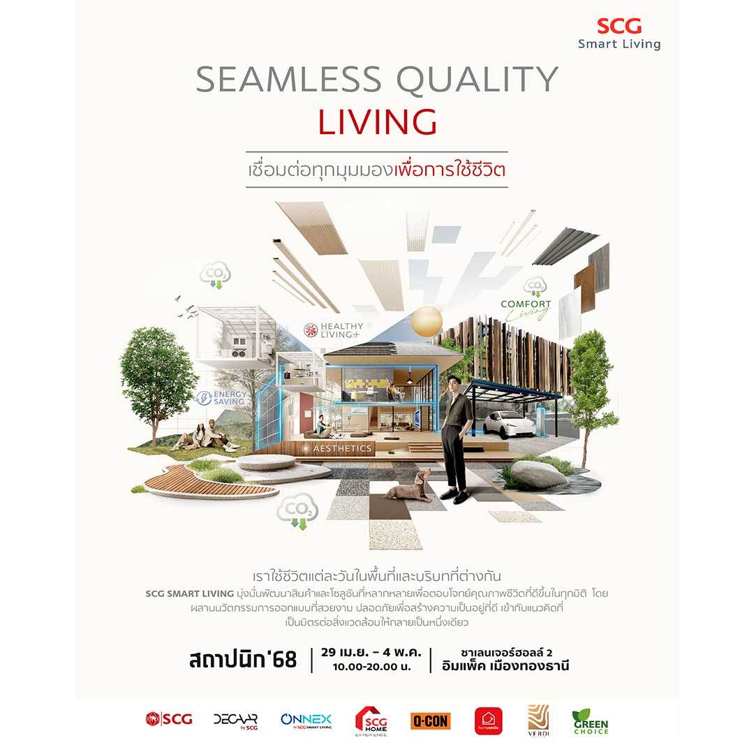 เอสซีจี สมาร์ทลีฟวิง จัดเต็มโชว์นวัตกรรมสินค้าและโซลูชันคาร์บอนค่ำ ตอบโจทย์บ้านอาคาร และสิ่งปลูกสร้างรักษ์โลก ในงานสถาปนิก’68 ภายใต้แนวคิด “Seamless Quality Living” ยกระดับคุณภาพการอยู่อาศัยผสมผสาน แนวคิดเป็นมิตรต่อสิ่งแวดล้อม ผ่านโปรเจค Waste to Construction โดยนำวัสดุเหลือใช้กลับมาเพิ่มมูลค่า ลดคาร์บอนฟุตพริ้นท์ และลดพลังงานในกระบวนการผลิต ตอกย้ำผู้นำวัสดุก่อสร้างคาร์บอนต่ำ (Low Carbon Materials) กับการใช้เทคโนโลยีที่ช่วยประหยัดพลังงาน สะอาด แข็งแรงปลอดภัย และยั่งยืนไปพร้อมๆ กัน