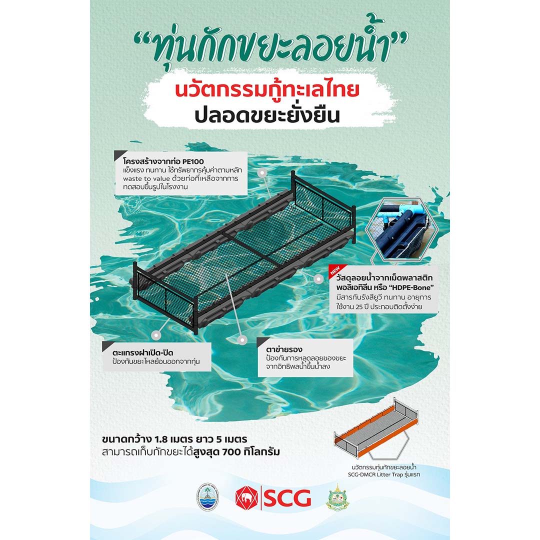 เอสซีจีมุ่งคิดค้นพัฒนานวัตกรรมที่ประยุกต์วัสดุพลาสติกที่มีความแข็งแรง ทนทานชนิดพิเศษ เพื่อตอบโจทย์การกักขยะในแม่น้ำลำคลองก่อนไหลลงสู่ท้องทะเล โดยได้ร่วมมือกับกรมทรัพยากรทางทะเลและชายฝั่ง (ทช.) กระทรวงทรัพยากรธรรมชาติและสิ่งแวดล้อม จนกลายมาเป็นนวัตกรรม “ทุ่นกักขยะลอยน้ำ” รุ่น 1 (SCG – DMCR Litter Trap: Generation 1) ซึ่งได้นำท่อชนิด PE100 ที่เป็นมิตรต่อสิ่งแวดล้อม มาทำงานร่วมกับวัสดุคล้ายเสื้อชูชีพ สามารถรองรับขยะได้กว่า 700 กิโลกรัม เพื่อนำไปติดตั้งบริเวณแม่น้ำลำคลอง