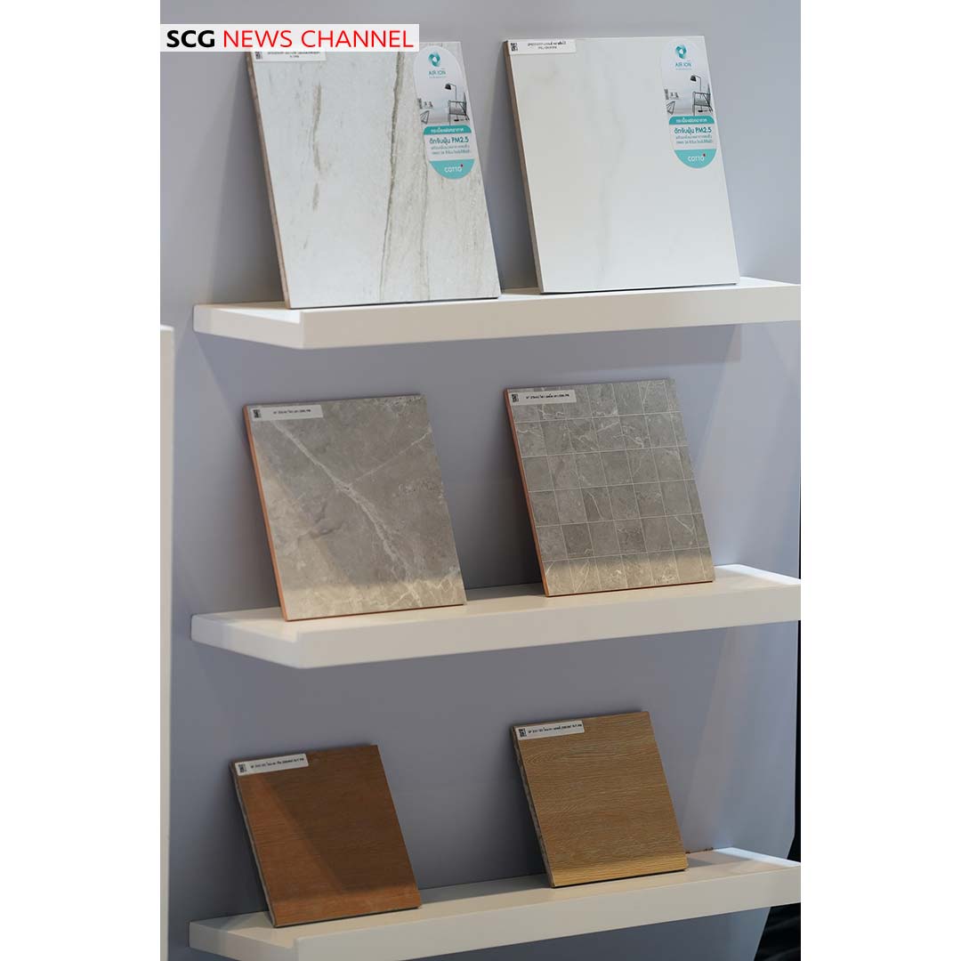 กระเบื้องฟองอากาศที่ช่วยดักจับฝุ่น PM2.5 ได้ถึง 89% หรือช่วยลดฝุ่น PM2.5 ภายใน 30 นาที เพื่อเพิ่มมวลอากาศสดชื่น ปรับคุณภาพอากาศให้คงที่ตลอด 24 ชั่วโมง โดยไม่ต้องใช้ไฟฟ้า เกิดจากชั้นเคลือบของกระเบื้องที่มีส่วนผสมจากแร่ธาตุธรรมชาติอย่าง Tourmaline ปล่อยไอออนออกมาที่ผิวหน้ากระเบื้องทำปฏิกิริยาเข้าจับฝุ่นที่ลอยตัวฟุ้งอยู่ในอากาศให้ตกสู่พื้นซึ่งได้รับความคุ้มครองทางด้านความลับทางการค้า