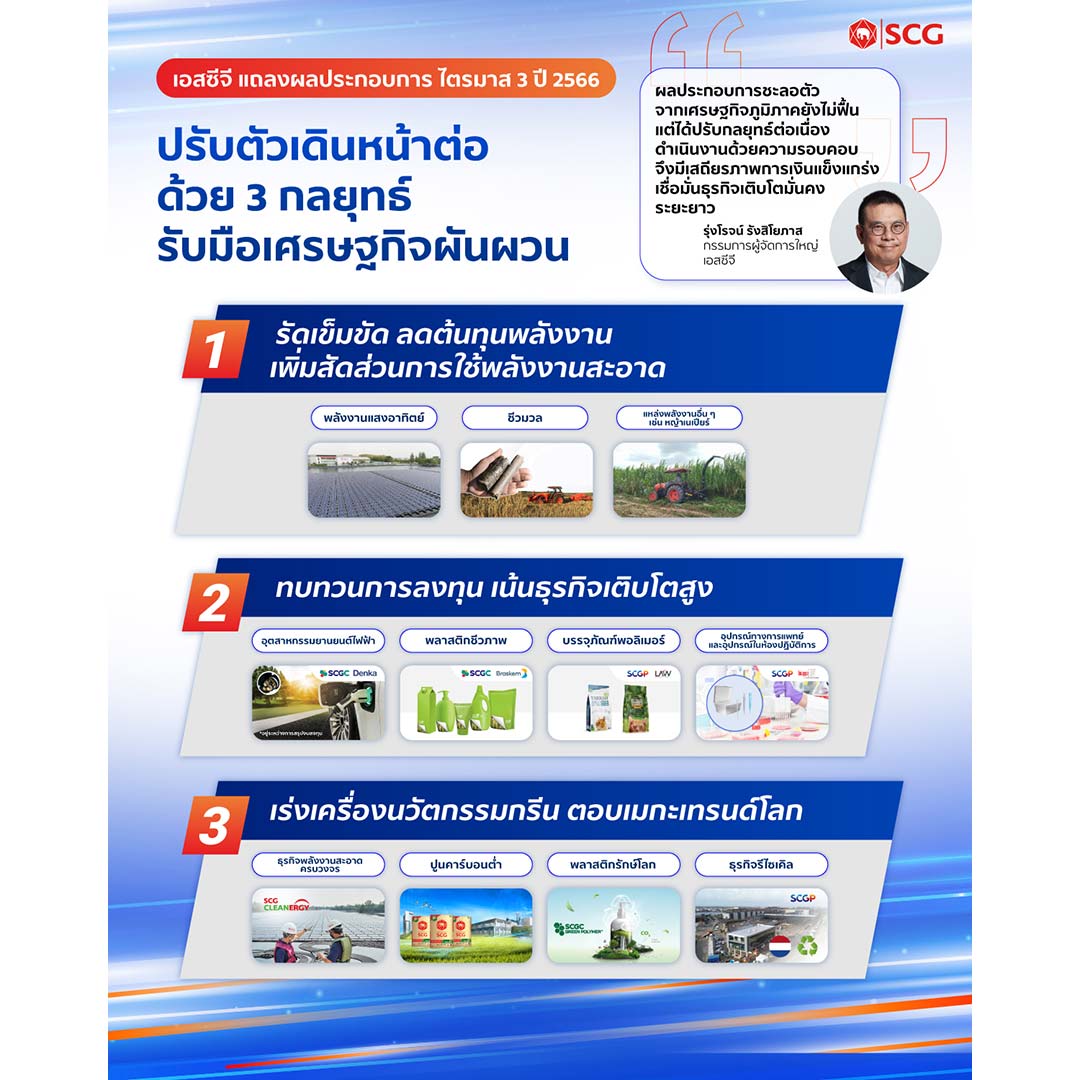 นายรุ่งโรจน์ รังสิโยภาส กรรมการผู้จัดการใหญ่ เอสซีจี กล่าวว่า “ผลประกอบการเอสซีจีไตรมาส 3 ปี 2566 ชะลอตัวจากช่วงเดียวกันของปีก่อน และลดลงจากช่วงครึ่งปีแรก เนื่องจากเศรษฐกิจภูมิภาคยังไม่ฟื้นตัว มีรายได้ 125,649 ล้านบาท ลดลงร้อยละ 12 จากช่วงเดียวกันของปีก่อน สาเหตุหลักจากยอดขายที่ลดลงของทุกกลุ่มธุรกิจ ประกอบกับธุรกิจเคมิคอลส์อยู่ในช่วงขาลง และสภาวะเศรษฐกิจในภูมิภาคยังไม่ฟื้นตัว ขณะที่กำไรสำหรับงวด 2,441 ล้านบาท และกำไรจากการดำเนินงาน 3,019 ล้านบาท โดยเพิ่มขึ้นร้อยละ 26 จากช่วงเดียวกันของปีก่อน และมีเงินสดคงเหลือแข็งแกร่ง 99,756 ล้านบาท เนื่องจากเอสซีจีได้ปรับกลยุทธ์ธุรกิจอย่างต่อเนื่อง และดำเนินงานด้วยความรอบคอบ ระมัดระวัง จึงยังรักษาเสถียรภาพการเงินได้มั่นคง สำหรับไตรมาส 4 เศรษฐกิจอาเซียนมีแนวโน้มดีขึ้น โดยเฉพาะอินโดนีเซียที่จะมีการลงทุน และการบริโภคเพิ่มขึ้นจากการก่อสร้างเมืองหลวงใหม่ “นูซันตารา” ขณะที่เศรษฐกิจไทยคาดการณ์ว่าจะฟื้นตัวดีขึ้น จากภาคอสังหาริมทรัพย์ และภาคการค้าในเมืองท่องเที่ยว ซึ่งได้รับอานิสงส์จากนักท่องเที่ยวที่เพิ่มขึ้น รวมทั้งค่าไฟฟ้าและราคาน้ำมันดีเซลอาจปรับตัวลง ทำให้ควบคุมต้นทุนพลังงานได้ดีขึ้น”