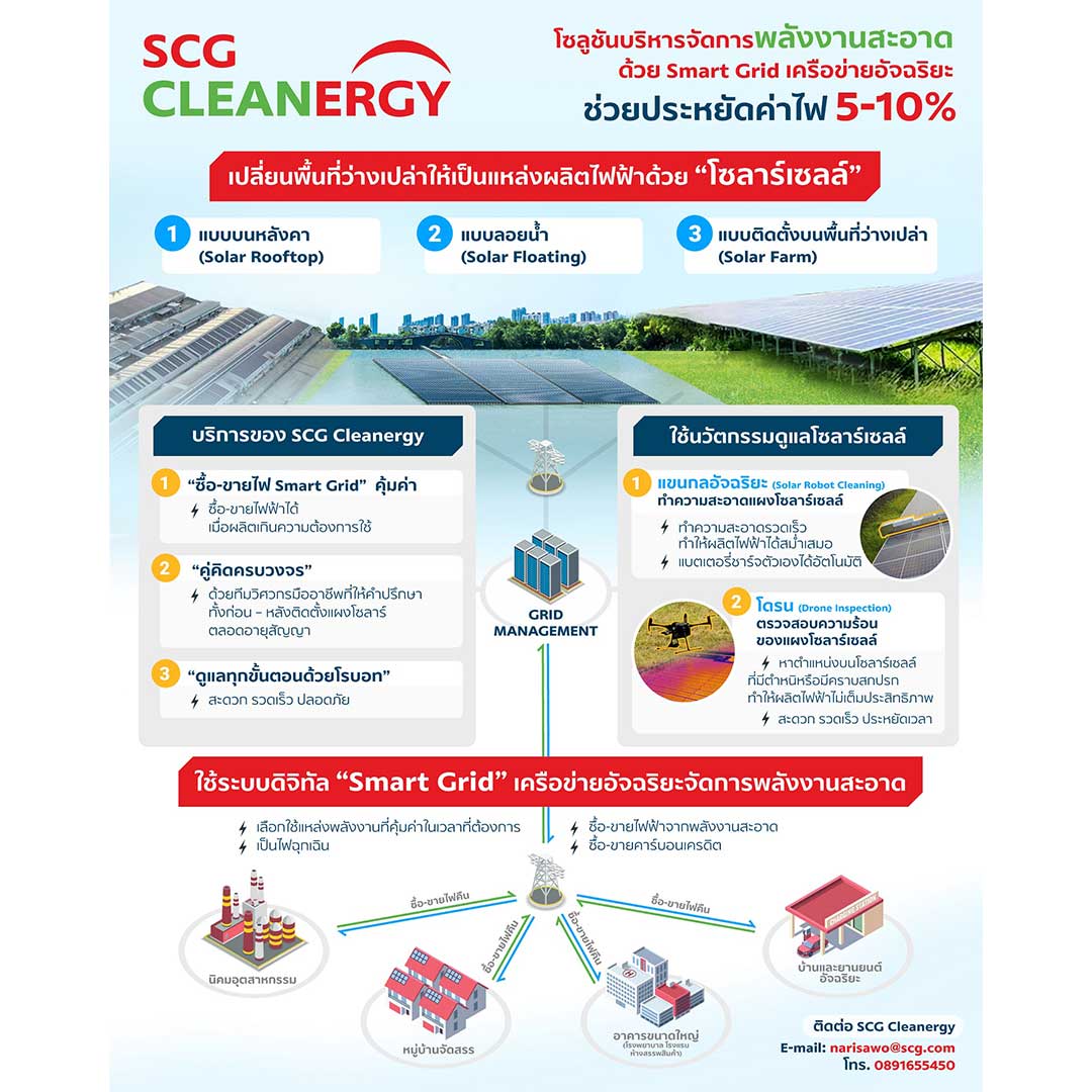 เอสซีจี รุกธุรกิจพลังงานสะอาดครบวงจร ลดต้นทุน แก้ปัญหาพลังงาน ค่าไฟพุ่งสูง หนุนเศรษฐกิจอาเซียนฟื้นตัว รองรับเมกกะเทรนด์รักษ์โลก ตั้งเป้าโต 4 เท่าในปีนี้ ปักธง เอสซีจี คลีนเนอร์ยี่ ผู้ผลิตไฟฟ้าจากพลังงานแสงอาทิตย์ เจาะกลุ่มลูกค้ากลุ่มนิคมอุตสาหกรรม โรงงาน บริษัทขนาดใหญ่ ห้างสรรพสินค้า โรงแรม โรงพยาบาล ที่ใช้ไฟฟ้าจำนวนมากแต่ต้องการลดต้นทุนค่าไฟ โดดเด่นด้วยนวัตกรรมระบบเครือข่ายไฟฟ้าอัจฉริยะ Smart Grid เทคโนโลยีโดรน-หุ่นยนต์เพิ่มประสิทธิภาพการทำงาน สะดวกด้วยบริการครบวงจร นอกจากนี้ ยังพัฒนาเม็ดพลังงานชีวมวลคุณภาพสูง จากวัสดุเหลือใช้การเกษตร