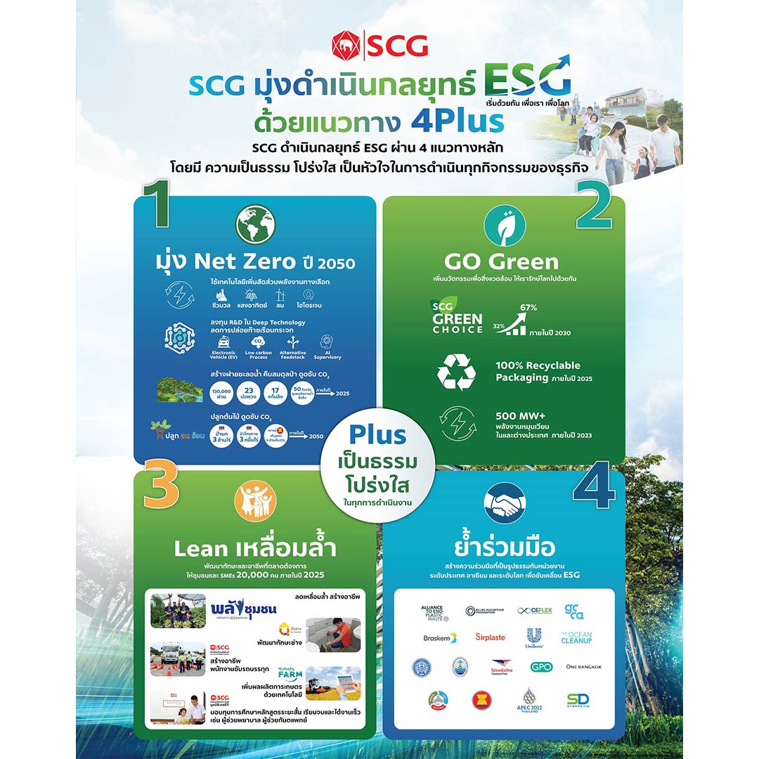 เอสซีจี ประกาศเดินหน้าธุรกิจควบคู่กู้วิกฤตโลกร้อน ทรัพยากรขาดแคลน และลดความเหลื่อมล้ำ ชูธง ESG 4 Plus “มุ่ง Net Zero – Go Green – Lean เหลื่อมล้ำ – ย้ำร่วมมือ”  ประมาณการเงินลงทุนเบื้องต้น 70,000 ล้านบาทในการปรับปรุงกระบวนการผลิต และพัฒนาธุรกิจคาร์บอนต่ำเพื่อให้บรรลุเป้าหมายการลดก๊าซเรือนกระจกสุทธิลงร้อยละ 20 ภายในปี 2030 รวมถึงพัฒนา Deep Technology เพื่อลดการปล่อยก๊าซเรือนกระจกสุทธิเป็นศูนย์ในปี 2050 ดูดซับคาร์บอนไดออกไซด์ 5 ล้านตัน ด้วยการระดมปลูกต้นไม้ 3 ล้านไร่  ต่อยอดสร้าง 130,000 ฝาย  เร่งดันนวัตกรรมรักษ์โลกเพิ่มขึ้น 2 เท่า อาทิ สินค้าฉลาก SCG Green Choice, นวัตกรรมการก่อสร้าง CPAC Green Solution, SCG Green Polymer และบรรจุภัณฑ์รีไซเคิล–ย่อยสลาย 100%  ลดสังคมเหลื่อมล้ำ ตั้งเป้าสร้างอาชีพที่ตลาดต้องการ 20,000 คน ประกาศร่วมมือกับทุกภาคส่วนเพื่อส่งมอบโลกที่น่าอยู่ให้คนรุ่นต่อไป ภายใต้การดำเนินงานอย่างโปร่งใสและเป็นธรรม