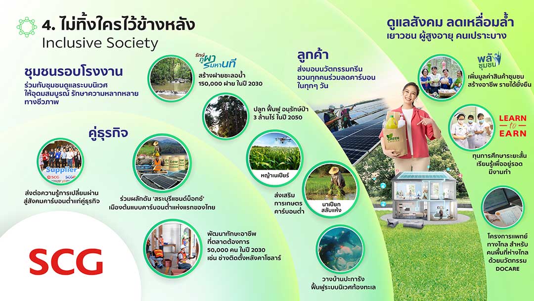 4) ไม่ทิ้งใครไว้ข้างหลัง (Inclusive Society) ชวนทุกคนในห่วงโซ่คุณค่า (Supply Chain) เปลี่ยนผ่านสู่สังคมคาร์บอนต่ำไปพร้อมกัน ด้วยการผลักดัน ‘สระบุรีแซนด์บ็อกซ์ เมืองต้นแบบคาร์บอนต่ำแห่งแรกของไทย’ เพื่อเรียนรู้ปัจจัยความสำเร็จ ข้อจำกัดในการเปลี่ยนประเทศไทย สู่สังคมคาร์บอนต่ำ และส่งเสริม ‘การเกษตรคาร์บอนต่ำ’ เช่น การทำนาเปียกสลับแห้งและการปลูกพืชพลังงาน อย่างหญ้าเนเปียร์ เพื่อใช้เป็นพลังงานทดแทน พร้อมทั้งสร้างเครือข่าย ‘Big Brothers for SMEs’ ใน จ.สระบุรี เพื่อส่งต่อความรู้ให้ผู้ประกอบการเปลี่ยนผ่านสู่สังคมคาร์บอนต่ำ ทั้งด้านพลังงานสะอาด นวัตกรรมรักษ์โลก การหาแหล่งเงินทุน ตลอดจน ‘พัฒนาทักษะอาชีพที่ตลาดต้องการ’ 50,000 คน ในปี 2573 ยกระดับแรงงานไทย มีอาชีพมั่นคง ลดเหลื่อมล้ำ เช่น ช่างติดตั้งและทำความสะอาดหลังคาโซลาร์ และนักเขียนแบบโดยใช้โปรแกรม BIM (Building Information Modelling) รวมทั้งจับมือกับชุมชน ‘ดูแลระบบนิเวศให้อุดมสมบูรณ์และรักษาความหลากหลายทางชีวภาพ’ ผ่านโครงการรักษ์ภูผามหานที มุ่งสู่เป้าหมายปลูก ฟื้นฟู อนุรักษ์ป่า 3 ล้านไร่ในปี 2593 ดูดซับคาร์บอนไดออกไซด์ได้มากกว่า 5 ล้านตันต่อปี ส่งต่อความยั่งยืนให้คนรุ่นต่อไป”
