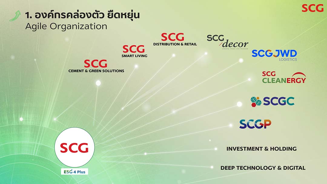 1) องค์กรคล่องตัว ยืดหยุ่น (Agile Organization) ทรานส์ฟอร์มโครงสร้าง สร้างความคล่องตัว ดันธุรกิจใหม่ที่มีศักยภาพเติบโตสูง เพื่อขยายขีดความสามารถของแต่ละธุรกิจให้พร้อมตอบสนอง ความต้องการของลูกค้ายุคใหม่ ที่เปลี่ยนแปลงตลอดเวลาได้อย่างทันท่วงที และความผันผวนของสถานการณ์โลก ประกอบด้วยธุรกิจ ‘เอสซีจี ซีเมนต์แอนด์กรีนโซลูชัน’ ธุรกิจวัสดุและโซลูชันก่อสร้าง ที่เป็นมิตรต่อสิ่งแวดล้อม ‘เอสซีจี สมาร์ทลีฟวิง’ ธุรกิจนวัตกรรมวัสดุก่อสร้าง และโซลูชันเพื่อการอยู่อาศัยที่ดีกว่า ‘เอสซีจี ดิสทริบิวชั่น แอนด์ รีเทล’ ธุรกิจจัดจำหน่ายวัสดุก่อสร้างและโซลูชันเพื่อการอยู่อาศัยระดับอาเซียน ‘เอสซีจี เคมิคอลส์ หรือ SCGC’ ผู้นำตลาดเคมีภัณฑ์ครบวงจรระดับภูมิภาค ซึ่งมุ่งเติบโตทางธุรกิจควบคู่กับความยั่งยืน ‘เอสซีจี คลีนเนอร์ยี่’ ธุรกิจพลังงานสะอาดครบวงจรที่กำลังขยายไปในอาเซียน โดยก่อนหน้านี้ได้ผลักดันธุรกิจ ในเอสซีจีที่มีศักยภาพสูง เข้าจดทะเบียนในตลาดหลักทรัพย์ฯ ไปแล้วอย่าง ‘บริษัทเอสซีจี แพคเกจจิ้ง จำกัด (มหาชน) หรือ SCGP’ ผู้นำบรรจุภัณฑ์แบบครบวงจรในภูมิภาคอาเซียน ‘บริษัทเอสซีจี เจดับเบิ้ลยูดีโลจิสติกส์ จำกัด (มหาชน) หรือ SCGJWD’ ผู้ให้บริการโลจิสติกส์และซัพพลายเชน ครบวงจรรายใหญ่สุดในอาเซียน และ ‘บริษัทเอสซีจี เดคคอร์ จำกัด (มหาชน) หรือ SCGD’ ผู้นำธุรกิจตกแต่งพื้นผิว และสุขภัณฑ์ครบวงจรระดับอาเซียน นอกจากนั้นยังมุ่งสร้างการเติบโตด้วย ‘การลงทุน (Investment & Holding)’ รวมทั้ง ‘เทคโนโลยีขั้นสูงและดิจิทัล (Deep Technology & Digital)’