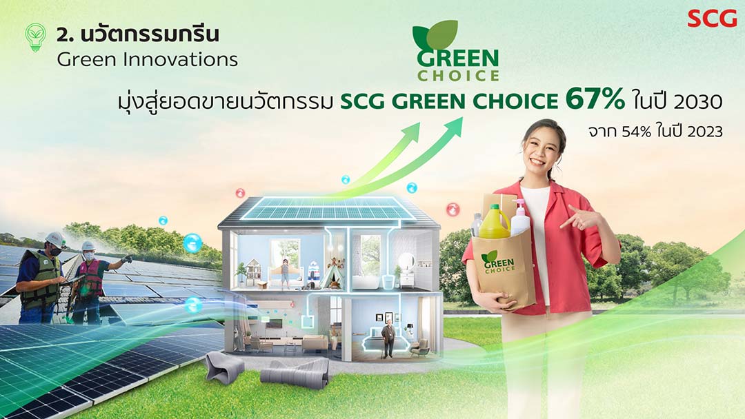 2) นวัตกรรมกรีน (Green Innovations) เร่งพัฒนานวัตกรรม โซลูชันที่เป็นมิตรต่อสิ่งแวดล้อม ซึ่งเป็นที่ต้องการสูงของตลาดโลก ให้ทุกคนมีส่วนร่วมสร้างสังคม Net Zero เช่น นวัตกรรมปูนคาร์บอนต่ำ สมาร์ทโซลูชันเพื่อการอยู่อาศัย พลาสติกรักษ์โลก บรรจุภัณฑ์ยั่งยืนที่ใช้ซ้ำ รีไซเคิลได้ พลังงานสะอาดครบวงจร พร้อมขยายเข้าสู่อุตสาหกรรมพลาสติกชีวภาพ อุตสาหกรรมที่เกี่ยวเนื่องกับการผลิตยานยนต์ไฟฟ้า ตลอดจนสร้างเครือข่ายความร่วมมือด้านการวิจัยระดับโลกเพื่อพัฒนานวัตกรรม และเทคโนโลยีเพื่อความยั่งยืน อาทิ ‘Norner AS’ ศูนย์วิจัยและพัฒนาพลาสติก ประเทศนอร์เวย์ และ ‘มหาวิทยาลัยออกซ์ฟอร์ด’ ประเทศอังกฤษ โดยตั้งเป้ารายได้จากนวัตกรรมรักษ์โลก SCG Green Choice ร้อยละ 67 จากยอดขายทั้งหมด ภายในปี 2573 พร้อมทั้งพัฒนากระบวนการผลิตคาร์บอนต่ำ ตามเป้าหมายการปล่อยก๊าซเรือนกระจกสุทธิเป็นศูนย์ ในปี 2593 (Net Zero 2050) ปัจจุบันคืบหน้าตามแผน