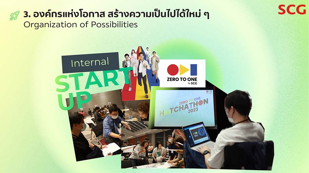 3) องค์กรแห่งโอกาส สร้างความเป็นไปได้ใหม่ ๆ (Organization of Possibilities) เปิดโอกาสให้พนักงานปล่อยแสง สร้างสรรค์นวัตกรรมและธุรกิจใหม่ ๆ ผ่านโครงการสตาร์ทอัพในเอสซีจี อาทิ พัฒนาแพลตฟอร์มสั่งซื้อสินค้าออนไลน์ ‘Prompt Plus’ ยกระดับการบริหารจัดการต้นทุนและสต๊อกสินค้าให้แก่ร้านค้ารายย่อยกว่า 10,000 รายในเครือข่ายเอสซีจี การบ่มเพาะสตาร์ทอัพในโครงการ ZERO TO ONE by SCG สร้างโอกาสให้พนักงานก้าวสู่การเป็นผู้ประกอบการ ปั้นธุรกิจศักยภาพสูงมากมาย เช่น ‘Dezpax.com’ แพลตฟอร์มออนไลน์แพคเกจจิ้ง ครบวงจรรายแรกในไทย สำหรับธุรกิจร้านอาหาร ฟู้ดเดลิเวอรี่ และคาเฟ่ ในการสร้างแพคเกจจิ้ง เป็นเอกลักษณ์ของตัวเองในจำนวนน้อย ราคาเหมาะสมกับ SMEs ซึ่งเติบโตกว่าร้อยละ 300 ในช่วง 3 ปีที่ผ่านมา เป็นที่ยอมรับจากผู้ประกอบการกว่า 10,000 รายทั่วประเทศ และ ‘Urbanice’ แพลตฟอร์มสื่อสาร บริหารจัดการ สำหรับชุมชนที่อยู่อาศัยอย่างคอนโดมิเนียมและหมู่บ้าน เพื่อการอยู่อาศัยแบบสมาร์ท สะดวก และมีความสุข มีผู้ใช้งานกว่า 250,000 คน ใน 850 โครงการทั่วประเทศ ตลอดจนสนับสนุนให้พนักงานพัฒนาธุรกิจใหม่ ๆ ตอบเทรนด์อนาคต ซึ่งได้รับความสนใจจากนักลงทุนภายนอกเอสซีจี เช่น ‘NocNoc’ ศูนย์รวมสินค้าและบริการเรื่องบ้านออนไลน์ ที่กำลังขยายธุรกิจทั้งในไทยและอาเซียน