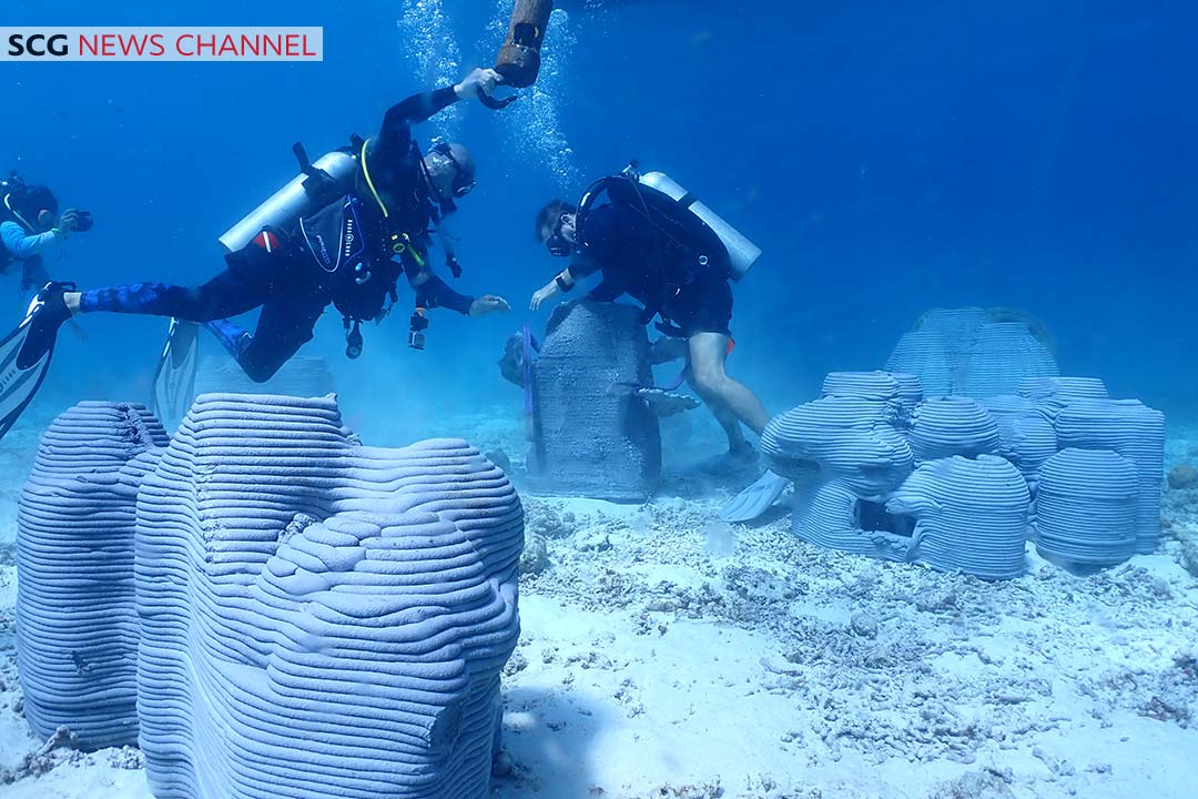นายธรรมศักดิ์ ยกตัวอย่างการนำเทคโนโลยีมาเป็นตัวเดินเรื่องในการฟื้นฟูธรรมชาติ “ระบบนิเวศทางท้องทะเล ได้รับผลกระทบจากอุณหภูมิโลกที่สูงขึ้น ทำให้ทรัพยากร และความอุดมสมบูรณ์ ของปะการังเสื่อมโทรม เอสซีจีจึงนำเทคโนโลยี CPAC 3D Printing Solution มาสร้างสรรค์ ‘บ้านปะการัง’ ที่มีความคล้ายกับปะการังจริง กลมกลืนกับธรรมชาติ มีประสิทธิภาพในการลงเกาะ และการเจริญเติบโตของตัวอ่อนปะการัง ผลิตจากปูนซีเมนต์รักษ์โลก ที่เป็นมิตรต่อสิ่งมีชีวิตใต้ทะเล แข็งแรง ทนทาน มุ่งฟื้นคืนความอุดมสมบูรณ์กลับสู่ท้องทะเลไทย