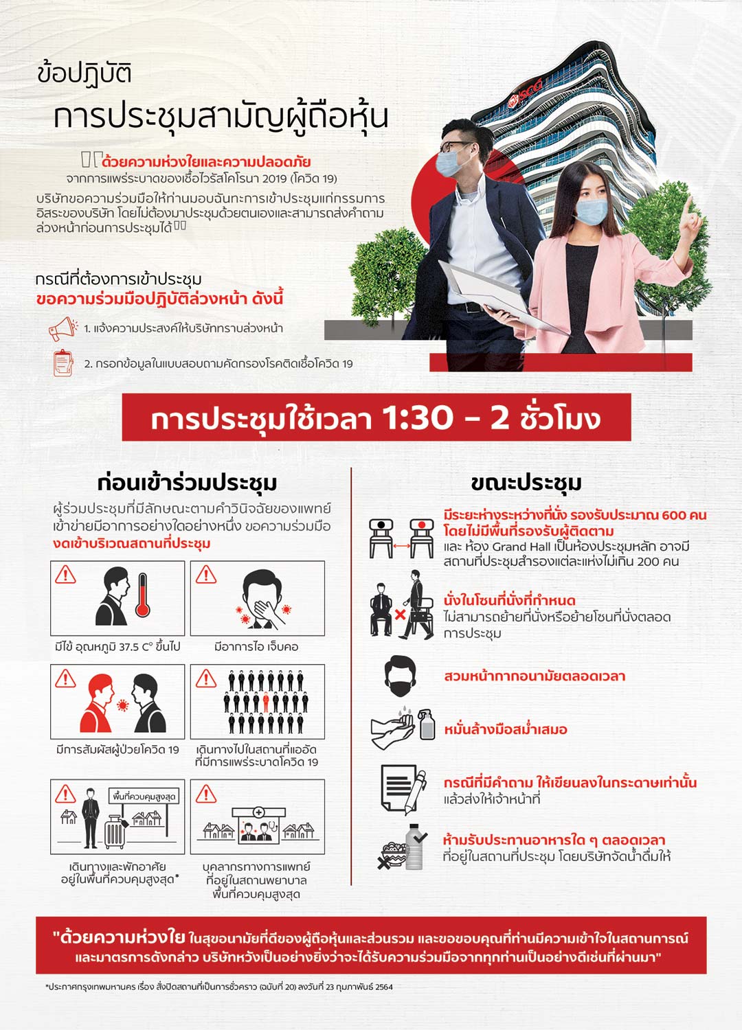 ทั้งนี้ เอสซีจี ได้จัดเตรียมสถานที่สำหรับการตรวจคัดกรองและลงทะเบียนไว้ในพื้นที่ที่มีอากาศถ่ายเทสะดวก และทำความสะอาดห้องประชุมหลักบริเวณ Grand Hall ชั้น 10 อาคารอเนกประสงค์ และบริเวณโดยรอบด้วยการพ่นน้ำยาฆ่าเชื้อก่อนวันประชุม โดยขอความร่วมมือให้ผู้ถือหุ้นหรือผู้รับมอบฉันทะปฏิบัติตามมาตรการต่าง ๆ เช่น สวมหน้ากากอนามัยตลอดเวลา รักษาระยะห่างระหว่างบุคคล ล้างมือด้วยแอลกอฮอล์เจลตามจุดต่าง ๆ ที่จัดไว้ ห้ามรับประทานอาหารหรือของว่างในห้องประชุม และนั่งประชุมในโซนที่กำหนดเท่านั้น เป็นต้น