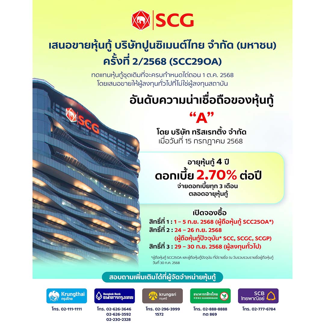 เอสซีจี เตรียมเสนอขายหุ้นกู้ชุดใหม่ ครั้งที่ 2/2568 ของบริษัทปูนซิเมนต์ไทย จำกัด (มหาชน) “SCC29OA” จำนวน 25,000 ล้านบาท อายุหุ้นกู้ 4 ปี ครบกำหนดไถ่ถอนปี พ.ศ. 2572 อัตราดอกเบี้ยคงที่ 2.70% ต่อปี จ่ายดอกเบี้ยทุก 3 เดือน อันดับความน่าเชื่อถือ หุ้นกู้ระดับ A จาก บริษัท ทริสเรทติ้ง จำกัด สะท้อนสถานะทางการเงิน ของเอสซีจีที่แข็งแกร่ง โดยเปิดให้จองซื้อตั้งแต่วันที่ 1 ก.ย. 2568*