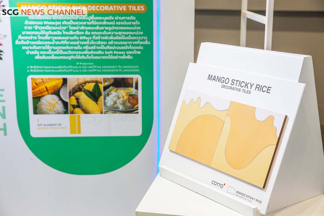 กระเบื้องเซรามิกส์ตกแต่งสำหรับปูพื้นเเละบุผนัง ผ่านการตัดด้วยระบบ waterjet เกิดเป็นลวดลายที่มีเอกลักษณ์ แรงบันดาลใจจาก “ข้าวเหนียวมะม่วง” โดยนำลักษณะเส้นสายรูปทรงของมะม่วง มาลดทอนให้ดูทันสมัย โทนสีเหลือง ส้ม แทนระดับความสุกของมะม่วงที่แตกต่าง โทนสีขาวผสมผสานกับ effect ที่สร้างผิวสัมผัสเป็นเม็ดแวววาว สื่อถึงข้าวเหนียวเเละน้ำกะทิที่ราดอย่างพริ้วไหวอิสระ สร้างบรรยากาศที่สดชื่น เหมาะกับการใช้งานตกแต่งภายใน หรือสร้างเป็นศิลปะบนผนังโดดเด่นนำสมัย กระเบื้องนี้เป็นนวัตกรรมเพื่อส่งเสริม Soft Power ของไทย เพื่อขับเคลื่อนเศรษฐกิจให้เติบโตในอนาคต ได้อย่างยั่งยืนซึ่งได้ยื่นขอรับความคุ้มครอง ทางด้านสิทธิบัตรการออกแบบผลิตภัณฑ์