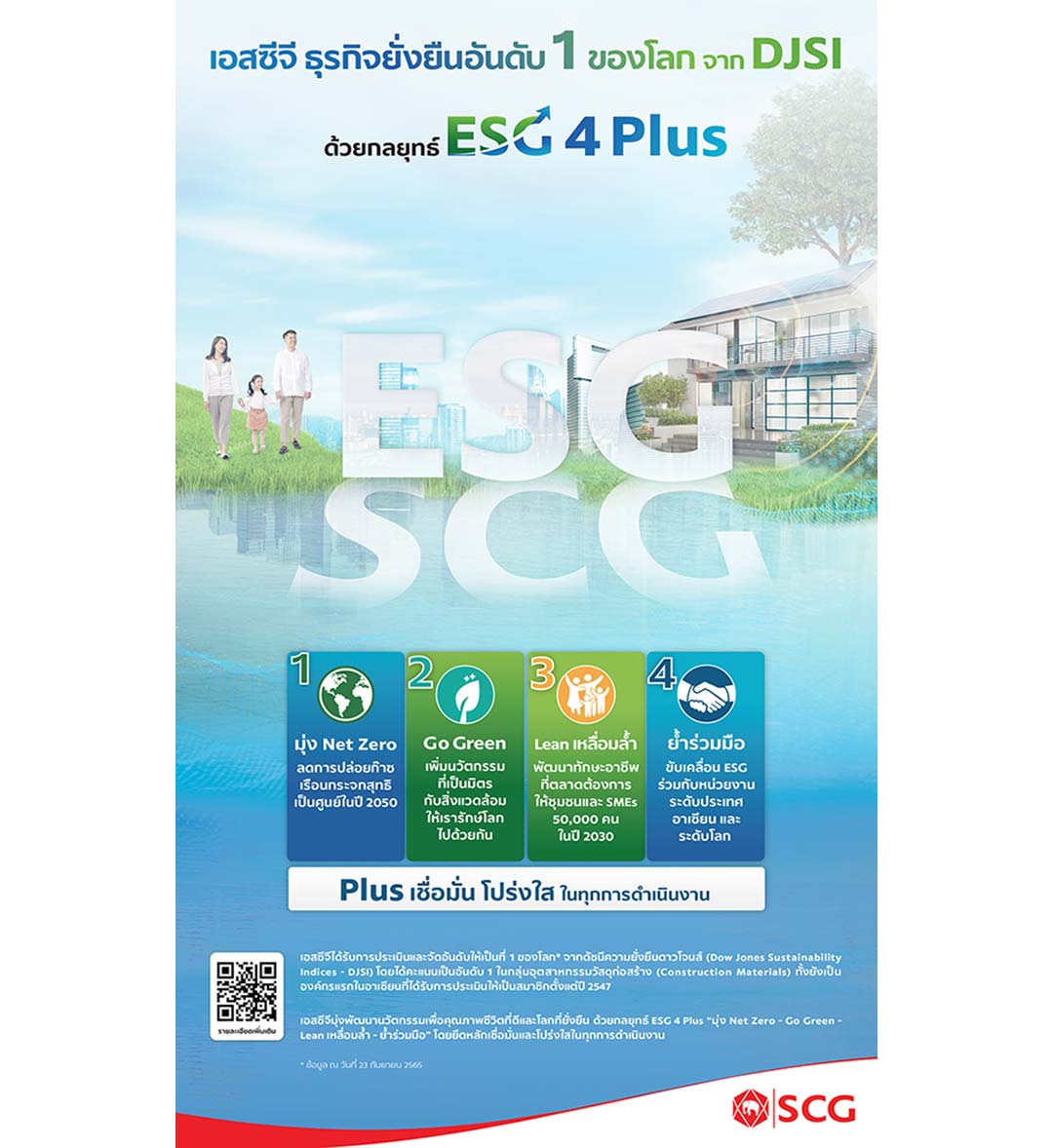 เอสซีจีที่ 1 ของโลกด้านการพัฒนาอย่างยั่งยืนจาก DJSI ในกลุ่มอุตสาหกรรมวัสดุก่อสร้าง (Construction Materials) และได้คะแนนสูงสุดด้านสิ่งแวดล้อม เป็นผลจากการดำเนินกลยุทธ์ ESG 4 Plus มุ่งเดินหน้าแก้วิกฤตภาวะโลกรวน และลดสังคมเหลื่อมล้ำ ตั้งเป้าลดการปล่อยก๊าซเรือนกระจกสุทธิเป็นศูนย์ในปี 2593 พัฒนาทักษะสร้างอาชีพ 50,000 คน พร้อมคิดค้นนวัตกรรมโซลูชัน เทคโนโลยีดิจิทัล ให้ลูกค้ามีความเป็นอยู่ที่ดีขึ้น และร่วมมือกับหน่วยงานต่าง ๆ เพื่อส่งต่อโลกที่ยั่งยืนให้คนรุ่นถัดไป
