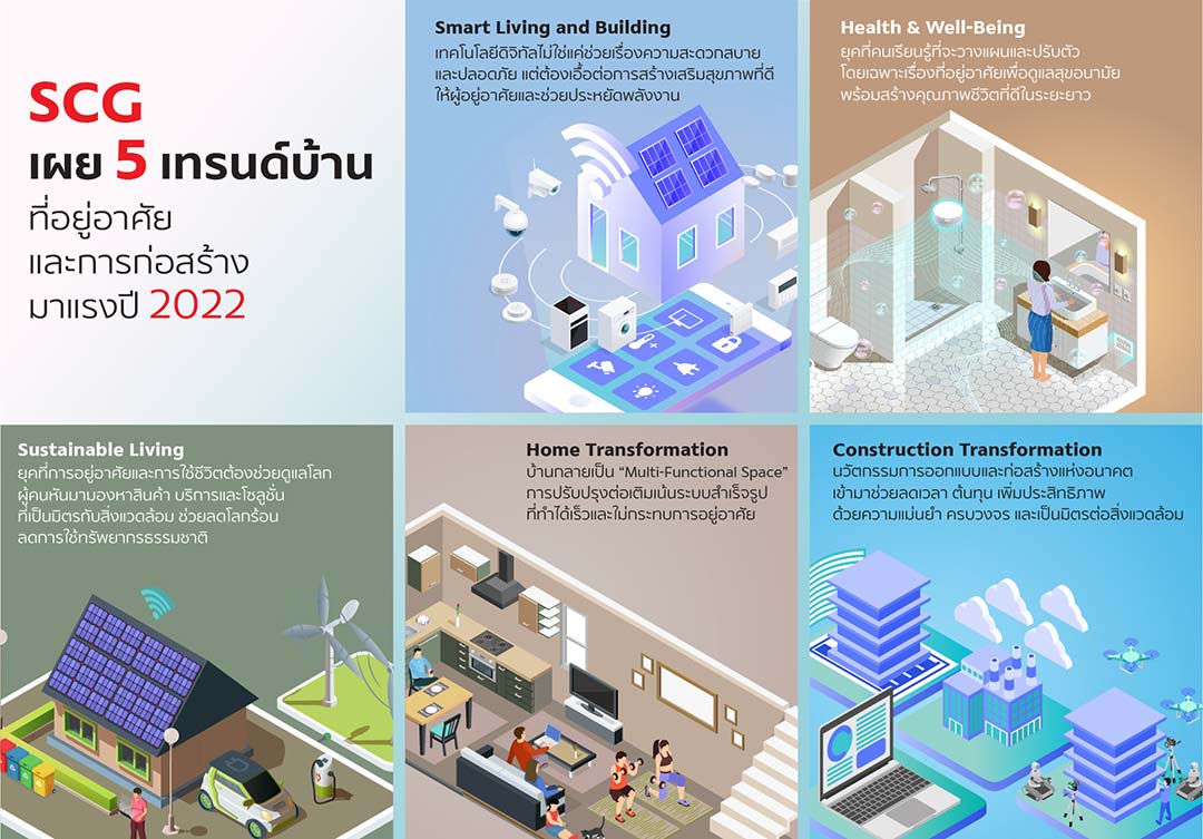 คงปฏิเสธไม่ได้ว่าการแพร่ระบาดของโควิด-19 ที่กินเวลานานกว่า 2 ปี รวมถึงวิกฤติโลกร้อนที่รุนแรงขึ้นอย่างต่อเนื่อง ทำให้ทุกบริบทของการใช้ชีวิต และการทำงาน ต้องเปลี่ยนแปลงไปตามเทรนด์โลกวิถีใหม่ ซึ่งปัจจุบันได้กลายเป็นวิถีชีวิตปกติของวันนี้ หรือ ‘Now Normal’ ที่ทุกคนเริ่มคุ้นเคย เรียนรู้ที่จะวางแผน และปรับชีวิตให้เข้ากับสถานการณ์ที่คาดเดาไม่ได้ เอสซีจี ในฐานะ Innovative leader ในวงการวัสดุก่อสร้าง อาคารและที่อยู่อาศัยจึงนำแนวคิด “นวัตกรรมอัจฉริยะ เพื่อคุณภาพชีวิตและการอยู่อาศัยที่ดีขึ้นอย่างยั่งยืน” (SCG for Smart Living, Smart City) มาผสานกับพฤติกรรมการอยู่อาศัยที่เปลี่ยนไป พร้อมแนะนำเป็น 5 เทรนด์บ้าน ที่อยู่อาศัย และการก่อสร้างแห่งปี 2022 เพื่อตอบโจทย์วิถี Now Normal สร้างคุณภาพชีวิตและการอยู่อาศัยที่ดีขึ้นในทุกๆ วัน ให้กับทุกๆ คน