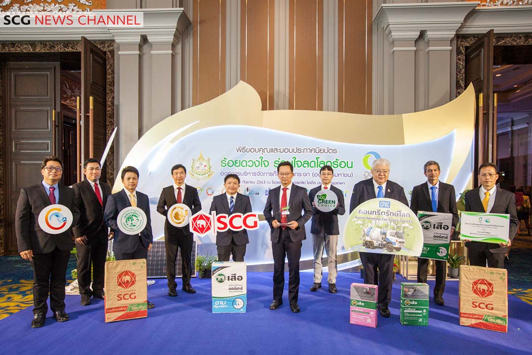 เอสซีจี โดยนายมงคล เฮงโรจนโสภณ (ซ้าย) ผู้ช่วยผู้จัดการใหญ่-ธุรกิจเคมิคอลส์ เอสซีจี และประธานคณะกรรมการการเปลี่ยนแปลงสภาพภูมิอากาศและพลังงาน เอสซีจี รับรางวัลยอดเยี่ยม จากโครงการตัวชี้วัดธุรกิจคาร์บอนต่ำและยั่งยืน (LCSi: Low Carbon and Sustainable Business Index) จากนายจตุพร บุรุษพัฒน์ (ขวา) ปลัดกระทรวงทรัพยากรธรรมชาติและสิ่งแวดล้อม ในงาน “ร้อยดวงใจ ร่วมใจลดโลกร้อน” จัดโดยองค์การบริหารจัดการก๊าซเรือนกระจก (องค์การมหาชน) โดยเอสซีจีได้กำหนดเป้าหมายระยะยาวในการลดการปล่อยก๊าซเรือนกระจกลงร้อยละ 28 ในปี 2573 (เทียบกับกรณีปกติ ณ ปีฐาน 2550) เพื่อควบคุมอุณหภูมิเฉลี่ยของโลกไม่ให้สูงเกิน 2 องศาเซลเซียส และได้เริ่มพิจารณาเป้าหมายที่สอดคล้องกับการควบคุมอุณหภูมิเฉลี่ยของโลกไม่ให้สูงเกิน 1.5 องศาเซลเซียส และเป้าหมายเป็นศูนย์ หรือ Net Zero Carbon อีกด้วย
