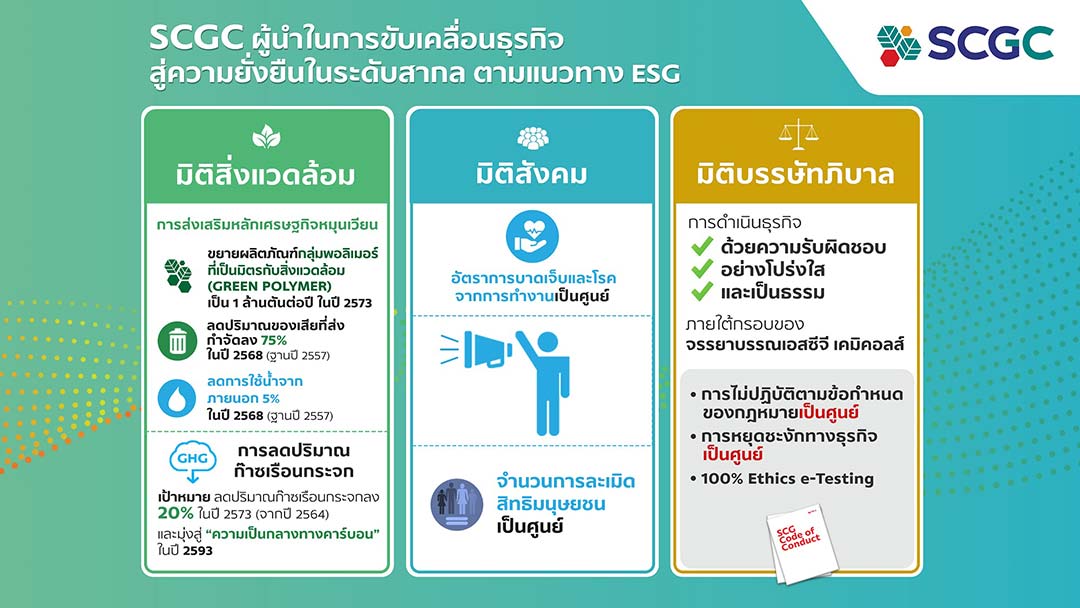 เอสซีจี เคมิคอลส์ หรือ เอสซีจีซี (SCGC) ตระหนักถึงวิกฤตที่โลกต้องเผชิญในปัจจุบัน ไม่ว่าจะเป็นสภาวะขาดแคลนทรัพยากร ภาวะโลกร้อน รวมไปถึงปัญหาความเหลื่อมล้ำในสังคมด้านต่าง ๆ ฯลฯ ดังนั้น เพื่อร่วมเป็นส่วนหนึ่งในการสร้างโลกและสังคมที่ยั่งยืน SCGC จึงประกาศเป้าหมายด้าน ESG อย่างเป็นรูปธรรม มุ่งสู่ “ผู้นำธุรกิจเคมีภัณฑ์ครบวงจรเพื่อความยั่งยืน ในภูมิภาคอาเซียน” เดินหน้าขับเคลื่อนการใช้ทรัพยากรอย่างคุ้มค่าตามหลักเศรษฐกิจหมุนเวียน เน้นพัฒนานวัตกรรมพอลิเมอร์ที่เป็นมิตรกับสิ่งแวดล้อม หรือ Green Polymer โดยตั้งเป้า 1 ล้านตันต่อปี ภายในปี 2573 นอกจากนี้ ยังมุ่งลดผลกระทบต่อภาวะโลกร้อน ด้วยการเพิ่มประสิทธิภาพด้านพลังงาน การใช้พลังงานหมุนเวียน และพัฒนาเทคโนโลยีคาร์บอนต่ำ เพื่อบรรลุเป้าหมายความเป็นกลางทางคาร์บอน รวมถึงการยกระดับคุณภาพชีวิต ให้กับชุมชน ส่งเสริมอาชีพ และสร้างวิถีสังคมคาร์บอนต่ำ