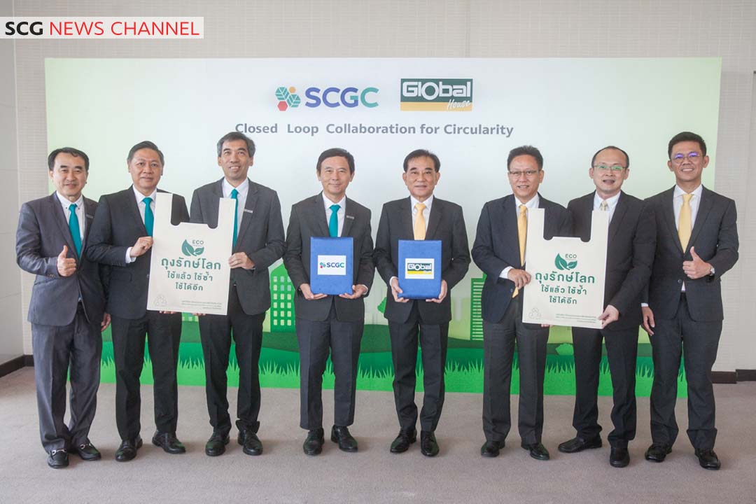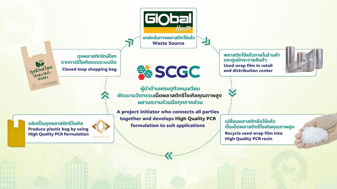 นายธนวงษ์ อารีรัชชกุล ประธานเจ้าหน้าที่บริหาร และกรรมการผู้จัดการใหญ่ บริษัท เอสซีจี เคมิคอลส์ จำกัด (มหาชน) หรือ SCGC กล่าวว่า “SCGC ส่งเสริมและขับเคลื่อนหลักเศรษฐกิจหมุนเวียน อย่างเป็นรูปธรรมร่วมกับทุกภาคส่วน โดยเน้นให้เกิดการนำพลาสติกใช้แล้ว กลับเข้าสู่กระบวนการรีไซเคิลแบบระบบปิด หรือที่เรียกว่า Closed Loop ซึ่งเป็นหัวใจสำคัญของหลักเศรษฐกิจหมุนเวียน สำหรับความร่วมมือกับโกลบอลเฮ้าส์นั้น SCGC ได้นำนวัตกรรมรีไซเคิลจาก SCGC GREEN POLYMERTM มาช่วยเปลี่ยนพลาสติกใช้แล้วของ Global House ให้เป็นเม็ดพลาสติกรีไซเคิลคุณภาพสูง (High Quality Post-Consumer Recycled Resin: High Quality PCR) เพื่อนำไปผลิตเป็น “ถุงพลาสติกรักษ์โลก” สำหรับใช้งานต่อไป ซึ่งส่งเสริมการใช้ทรัพยากรให้เกิดประโยชน์สูงสุด ช่วยลดการเกิดของเสีย และลดการปล่อยก๊าซเรือนกระจก เพื่อสิ่งแวดล้อมที่ยั่งยืนตามแนวทาง Low Waste, Low Carbon”
