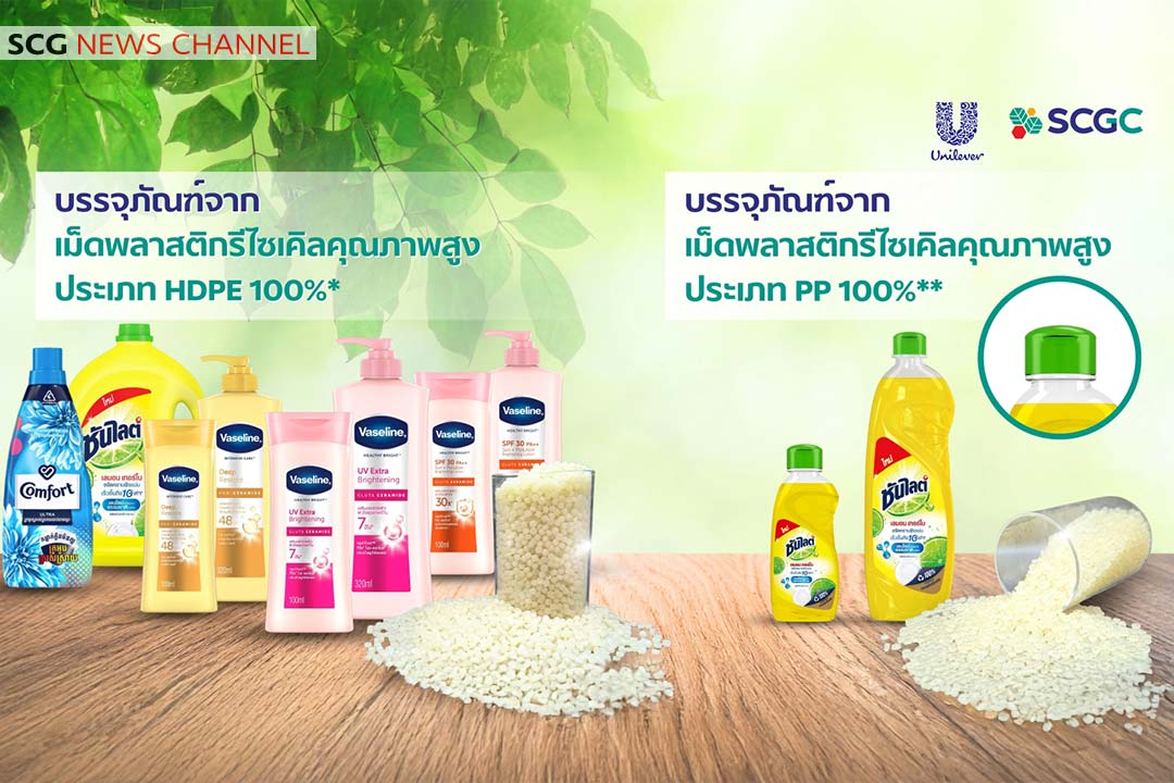สำหรับความร่วมมือระหว่าง SCGC และกลุ่มบริษัท ยูนิลีเวอร์ ประเทศไทย หรือ Unilever ผู้ผลิตสินค้าอุปโภคบริโภครายใหญ่ระดับโลก เพื่อพัฒนาบรรจุภัณฑ์ที่เป็นมิตรกับสิ่งแวดล้อม ยังคงเดินหน้าอย่างเป็นรูปธรรม โดยที่ผ่านมา ได้มีการนำพลาสติกใช้แล้ว จากภาคครัวเรือน ผลิตเป็นเม็ดพลาสติกรีไซเคิลคุณภาพสูงพอลิเอทิลีนความหนาแน่นสูง (High Quality PCR HDPE Resin) เปลี่ยนเป็นบรรจุภัณฑ์รักษ์โลก ได้แก่ ขวดแกลลอนน้ำยาล้างจานซันไลต์* ขวดน้ำยาปรับผ้านุ่มคอมฟอร์ท* และขวดวาสลีน* โดยบรรจุภัณฑ์รีไซเคิลดังกล่าว ยังคงคุณสมบัติที่ดีไว้อย่างครบถ้วน ไม่ส่งผลกระทบต่อคุณภาพ กลิ่น หรือเนื้อสัมผัสของผลิตภัณฑ์ นอกจากนี้ยังได้ร่วมกันพัฒนา ฝาขวดน้ำยาล้างจานซันไลต์** ซึ่งผลิตจากเม็ดพลาสติกรีไซเคิล คุณภาพสูงพอลิโพรพิลีน (High Quality PCR PP Resin) สะท้อนความเป็นผู้นำในการขับเคลื่อนธุรกิจ สู่ความยั่งยืนในระดับสากล