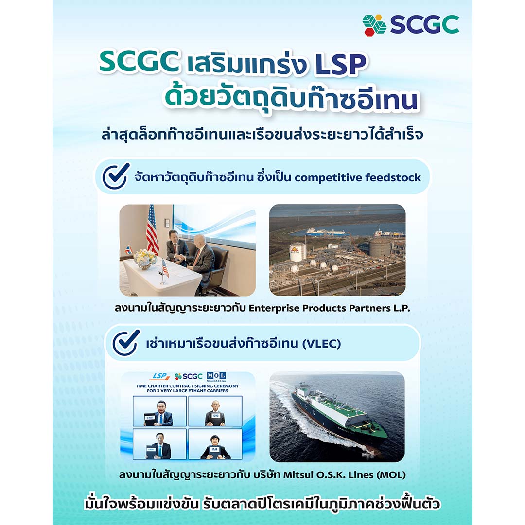 นายศักดิ์ชัย ปฏิภาณปรีชาวุฒิ ประธานเจ้าหน้าที่บริหารและกรรมการผู้จัดการใหญ่ SCGC เผยว่า “SCGC ขับเคลื่อนโครงการเพิ่มวัตถุดิบ ก๊าซอีเทน ที่โรงงาน LSP ประเทศเวียดนาม (โครงการ LSPE) อย่างเร่งด่วนตามแผนเชิงรุก เพื่อเพิ่มขีดความสามารถในการแข่งขัน และลดต้นทุนอย่างมีนัยสำคัญ มั่นใจ พร้อมเดินหน้ารับตลาดปิโตรเคมี ช่วงฟื้นตัวในอนาคต โดยความคืบหน้าล่าสุด ได้จัดหาและล็อกวัตถุดิบก๊าซอีเทน จากสหรัฐอเมริกาเป็นผลสำเร็จ พร้อมลงนามในสัญญาระยะยาว เพื่อจัดหาวัตถุดิบก๊าซอีเทน ประมาณ 1 ล้านตันต่อปี เป็นระยะเวลา 15 ปี กับ Enterprise Products Partners ผู้จัดหาก๊าซอีเทนชั้นนำจากสหรัฐอเมริกา และลงนามในสัญญาระยะยาว สำหรับเช่าเหมาเรือขนส่งก๊าซอีเทน (Very Large Ethane Carriers: VLECs) กับบริษัท Mitsui O.S.K. Lines (MOL) ผู้ให้บริการเรือขนส่งวัตถุดิบชั้นนำของโลก รอบแรกจำนวน 3 ลำ ซึ่ง MOL จะให้บริการขนส่งก๊าซอีเทนจากสหรัฐอเมริกา ไปยังประเทศเวียดนามเป็นเวลา 15 ปี ทั้งนี้สัญญาเช่าเหมาเรืออีก 2 ลำที่เหลืออยู่ระหว่างดำเนินการ จึงมั่นใจได้ว่าโรงงาน LSP จะสามารถแข่งขันได้ในระยะยาว ด้วยต้นทุนที่ต่ำลงอย่างมีนัยสำคัญ ทั้งนี้ โรงงาน LSP ถูกออกแบบมาให้มีความยืดหยุ่น ในการรับวัตถุดิบก๊าซอยู่แล้ว จึงสามารถปรับปรุงโรงงานให้ใช้วัตถุดิบ ที่เป็นก๊าซอีเทนได้มากถึงสองในสาม ของปริมาณวัตถุดิบทั้งหมด ซึ่งส่วนที่เหลือจะเป็นก๊าซโพรเพนและแนฟทา”