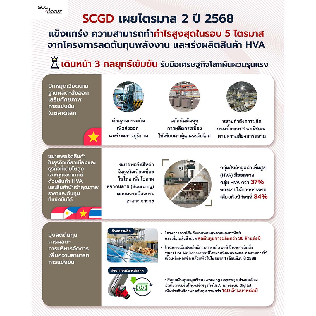 SCGD เผยไตรมาส 2 ปี 2568 แข็งแกร่ง ความสามารถทำกำไรสูงสุดในรอบ 5 ไตรมาส ยกระดับกลยุทธ์เข้มข้น ปักหมุดเวียดนามฐานผลิตหลัก-หนุนส่งออก เร่ง HVA ธุรกิจสินค้าเกี่ยวเนื่อง เพิ่มมูลค่า มุ่งลดต้นทุนการผลิต-บริหารจัดการ ขยายพอร์ตสินค้ารับดีมานด์ตลาดภูมิภาคโต