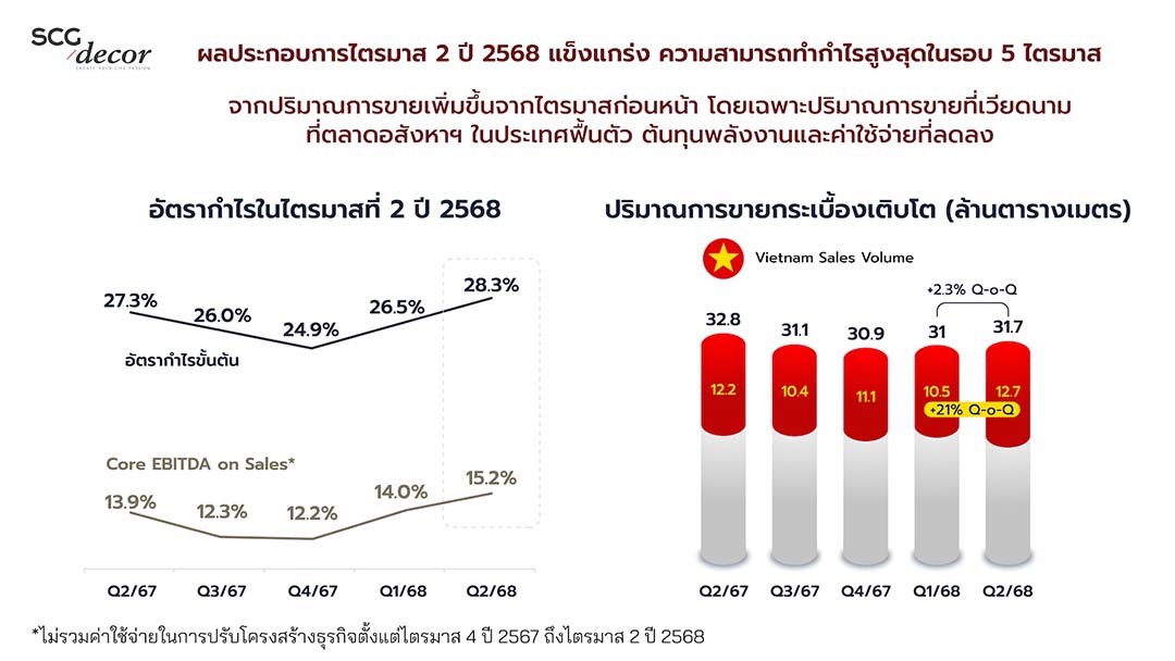 30 กรกฎาคม 2568 – SCGD เผยผลประกอบการไตรมาส 2 ปี 2568 แข็งแกร่งขึ้น มีความสามารถทำกำไรต่อเนื่อง เทียบไตรมาสก่อน กำไรไม่รวมค่าใช้จ่ายปรับโครงสร้างธุรกิจ 283 ล้านบาท เพิ่มขึ้น 19% จากโครงการลดต้นทุนพลังงาน เตรียมคว้าโอกาสจากการฟื้นตัว ของตลาดอสังหาฯ ในเวียดนาม และเพิ่มความสามารถ ในการแข่งขันในตลาดโลก เร่งผลิตและจัดหาสินค้า HVA และสินค้าเกี่ยวเนื่อง เดินหน้าปรับตัวฉับไวรับมือเศรษฐกิจผันผวนรุนแรง ชู 3 กลยุทธ์เข้มข้น 1.) ปักหมุดเวียดนามเป็นฐานการผลิต-ส่งออก เสริมศักยภาพ การแข่งขันในตลาดโลก ทั้งด้านต้นทุนการผลิต และด้านเพิ่มกำลังการผลิตกระเบื้องเกรซ พอร์ซเลน รองรับตลาดเติบโต 2.) ขยายพอร์ตสินค้าในธุรกิจเกี่ยวเนื่อง และธุรกิจที่มีการเติบโตสูง เจาะตลาดทุกเซกเมนต์ด้วยสินค้า HVA และสินค้านำเข้าคุณภาพ ราคาและต้นทุนที่แข่งขันได้ 3.) มุ่งลดต้นทุนการผลิตผ่านการปรับโครงสร้างธุรกิจ และลดเงินทุนหมุนเวียนอย่างต่อเนื่อง เพิ่มขีดความสามารถในการแข่งขัน SCGD​ จ่ายปันผลเพิ่มเป็น 0.15 บาท เพื่อเป็นการดูแลผู้ถือหุ้น ในช่วงที่เศรษฐกิจผันผวนทั้งโลกและไทย​ และแสดงถึงความมั่นใจในธุรกิจที่เติบโต​ มีกระแสเงินสด และฐานะการเงินแข็งแกร่ง