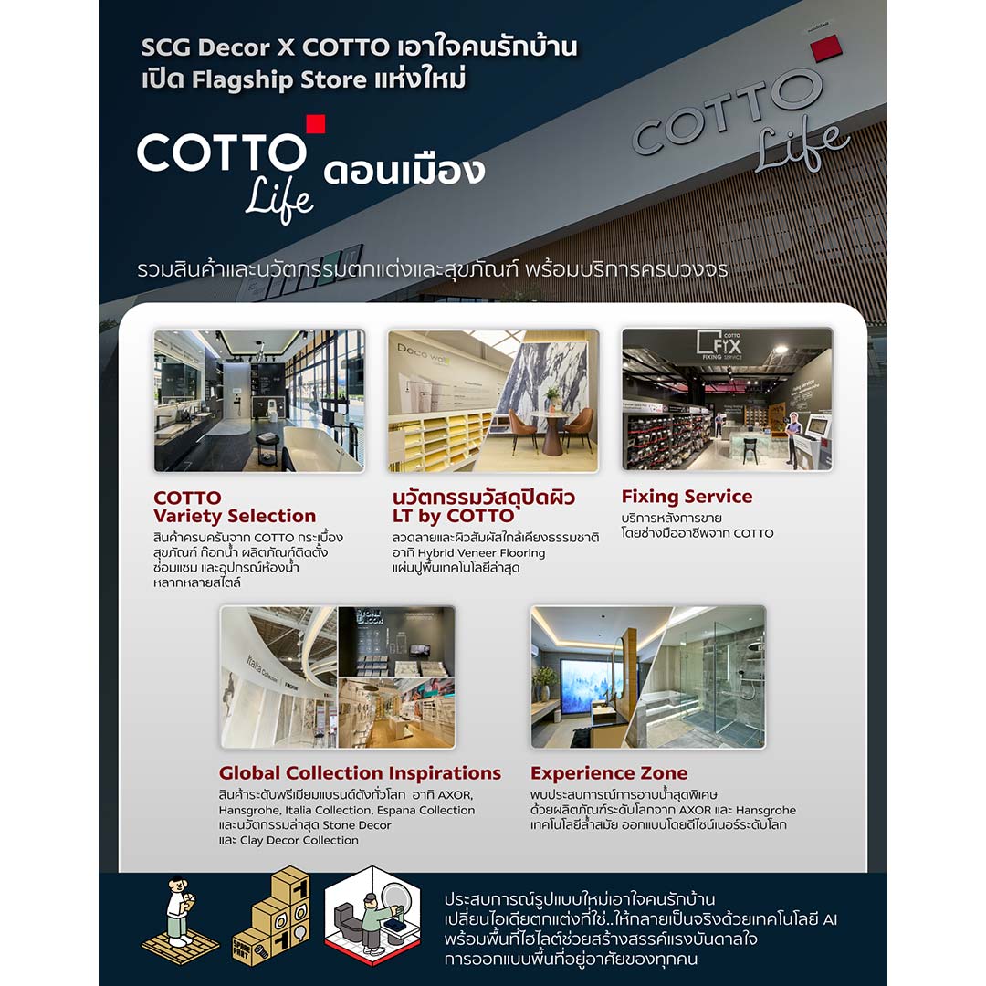 นายสิทธิชัย สุขกิจประเสริฐ กรรมการผู้จัดการ บริษัท สยามซานิทารีแวร์ จำกัด หรือ COTTO กล่าวว่า  COTTO LiFE ดอนเมือง นับเป็นสาขาที่ 4 ต่อจาก CDC เชียงใหม่และขอนแก่น ถือเป็นแฟลกชิปโชว์รูมของ COTTO ที่มีขนาดใหญ่ที่สุดในประเทศไทย ด้วยพื้นที่กว่า 2,500 ตารางเมตร เพื่อสร้างแรงบันดาลใจในการตกแต่งพื้นที่อยู่อาศัยและห้องน้ำ ด้วยสินค้าคุณภาพหลากหลาย ทั้งแบรนด์ภายใต้ COTTO และแบรนด์ชั้นนำจากทั่วโลกมาไว้ในที่เดียว สามารถตอบโจทย์ทุกความต้องการของลูกค้า ครอบคลุมทุกไลฟ์สไตล์ ตั้งแต่สินค้ากลุ่มสุขภัณฑ์ ก๊อกน้ำ เฟอร์นิเจอร์ห้องน้ำ กระเบื้องหลากดีไซน์ จนถึงนวัตกรรมวัสดุปิดผิว SPC สำหรับตกแต่งพื้นและผนัง นอกจากนี้ ยังมีสินค้าระดับพรีเมียมจากแบรนด์ดังระดับโลก ที่เป็นพาร์ตเนอร์รวบรวมไว้ในที่เดียว พร้อมทั้งบริการอย่างครบครัน ช่วยเนรมิตพื้นที่อยู่อาศัยได้ตามที่ต้องการ