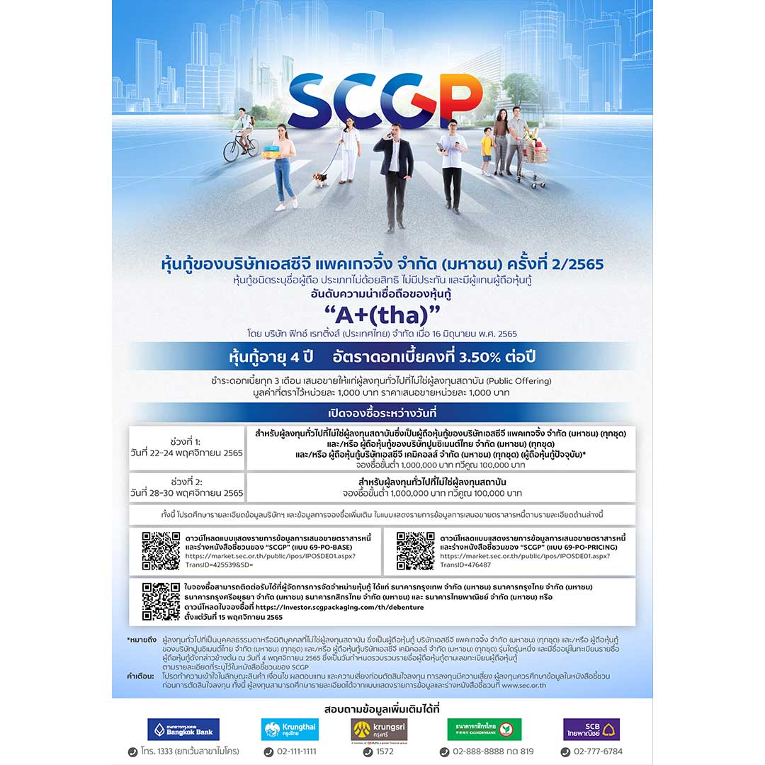 SCGP เตรียมออกหุ้นกู้ อายุ 4 ปี อัตราดอกเบี้ยคงที่ร้อยละ 3.50 ต่อปี จ่ายดอกเบี้ยทุก 3 เดือน ด้วยอันดับความน่าเชื่อถือหุ้นกู้ A+(tha) จากฟิทช์ เรทติ้งส์ (ประเทศไทย) สะท้อนฐานะการเงินและสถานะธุรกิจที่แข็งแกร่ง เปิดจองซื้อสำหรับผู้ถือหุ้นกู้ปัจจุบันของบริษัทเอสซีจี แพคเกจจิ้ง จำกัด (มหาชน) (ทุกชุด) และ/หรือ ผู้ถือหุ้นกู้บริษัทปูนซิเมนต์ไทย จำกัด (มหาชน) (ทุกชุด) และ/หรือ ผู้ถือหุ้นกู้บริษัทเอสซีจี เคมิคอลส์ จำกัด (มหาชน) (ทุกชุด) ในวันที่ 22 – 24 พฤศจิกายนนี้ และผู้ลงทุนทั่วไปที่ไม่ใช่ผู้ลงทุนสถาบัน สามารถจองซื้อได้ในวันที่ 28 – 30 พฤศจิกายนนี้ ที่ธนาคารกรุงเทพ ธนาคารกรุงไทย ธนาคารกรุงศรีอยุธยา ธนาคารกสิกรไทย และธนาคารไทยพาณิชย์