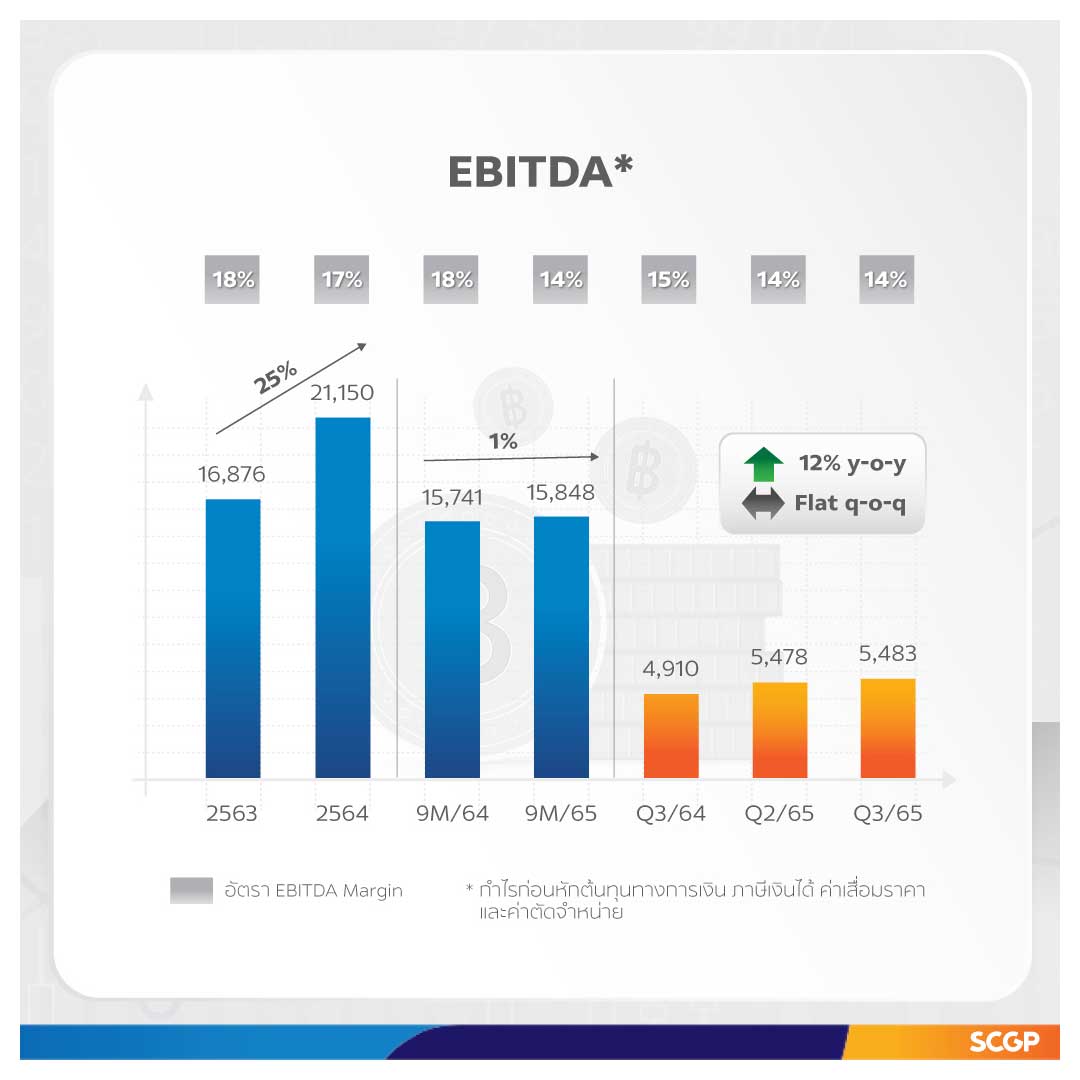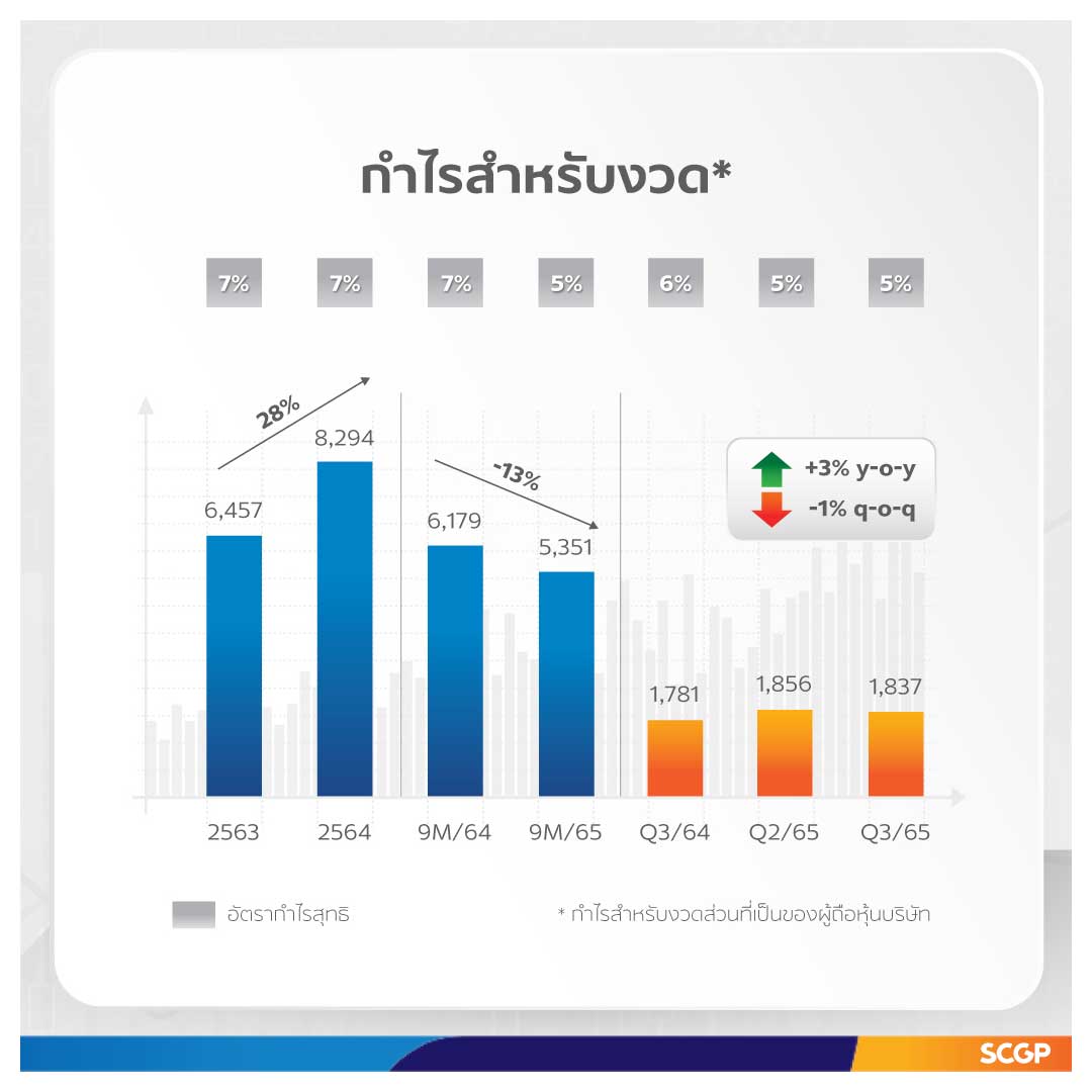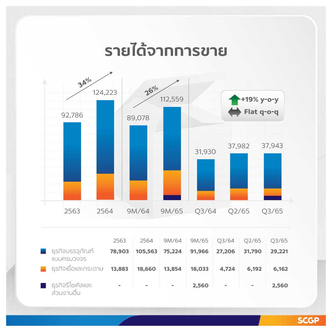 สำหรับไตรมาสที่ 3 ของปี 2565 SCGP มีรายได้จากการขาย 37,943 ล้านบาท เพิ่มขึ้นร้อยละ 19 มี EBITDA อยู่ที่ 5,483 ล้านบาท เพิ่มขึ้นร้อยละ 12 และกำไรสำหรับงวด 1,837 ล้านบาท เพิ่มขึ้นร้อยละ 3 เมื่อเทียบกับช่วงเดียวกันของปีก่อน จากราคาขายสินค้าที่สะท้อนต้นทุน ราคาเยื่อที่สูงขึ้นและความต้องการใช้บรรจุภัณฑ์ของกลุ่มสินค้าอาหารและเครื่องดื่มและสินค้าอุปโภคบริโภคในภูมิภาคอาเซียนที่เพิ่มขึ้น รวมถึงการขยายธุรกิจจากการควบรวมกิจการบริษัทรีไซเคิลวัสดุบรรจุภัณฑ์ Peute Recycling B.V. (Peute) ประเทศเนเธอร์แลนด์ และ Jordan Trading Inc. (Jordan) สหรัฐอเมริกา