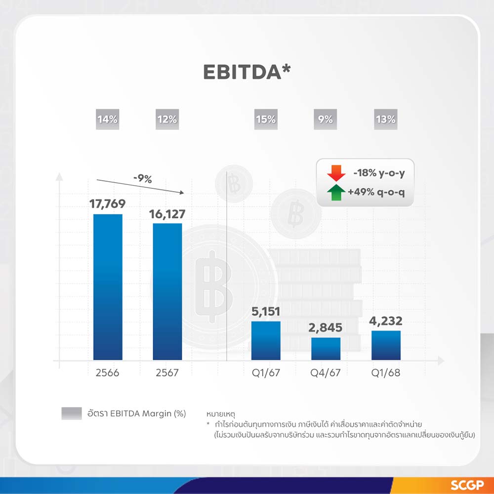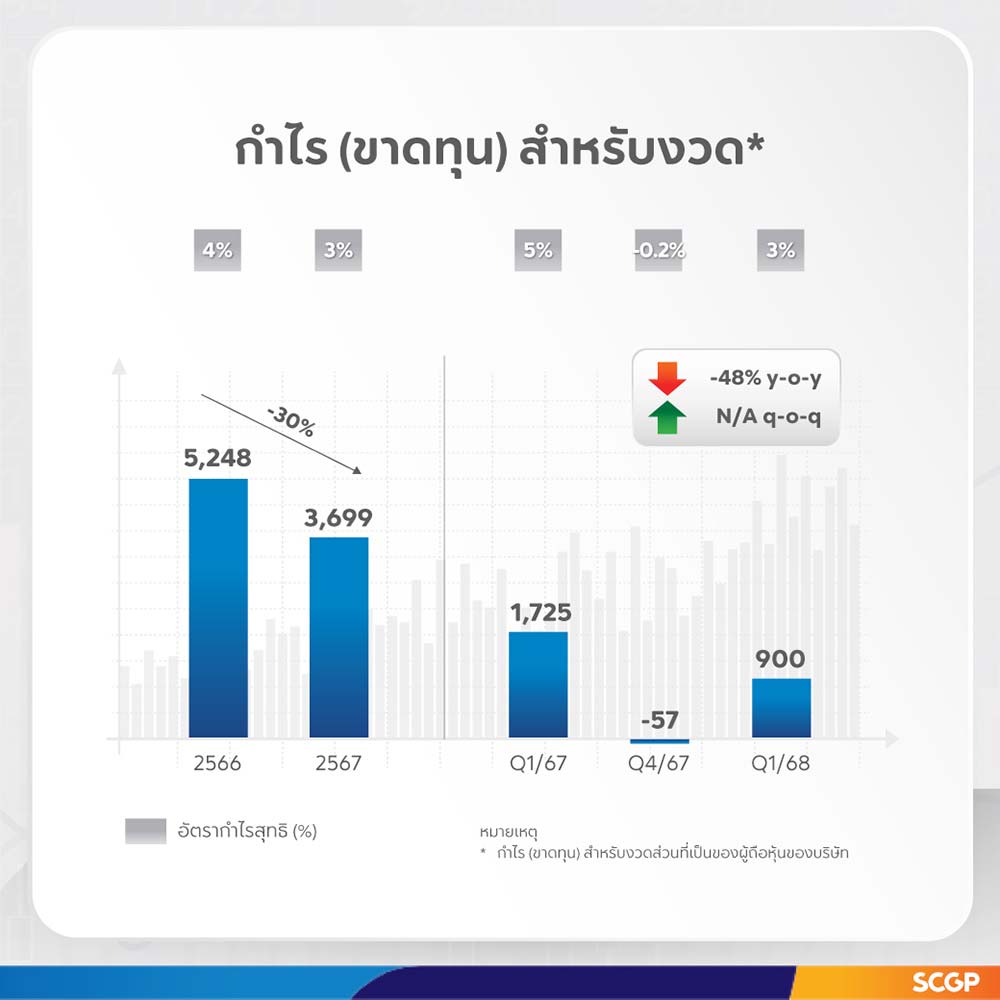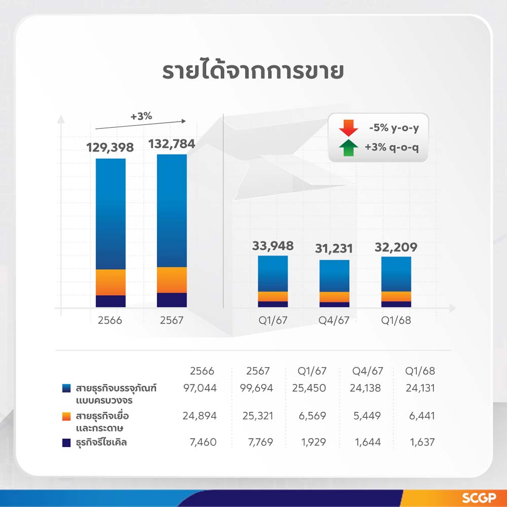 SCGP มุ่งเน้นการขายภายในประเทศภูมิภาคอาเซียน เพื่อตอบสนองความต้องการใช้บรรจุภัณฑ์ที่เพิ่มขึ้น เพิ่มสัดส่วนกลุ่มบรรจุภัณฑ์อุปโภคบริโภค รวมถึงปรับกลยุทธ์การส่งออกกระดาษบรรจุภัณฑ์ไปยังประเทศต่าง ๆ ในอาเซียน เอเชียใต้ และตะวันออกกลาง นอกจากนี้ SCGP สามารถเพิ่มประสิทธิภาพในการลดต้นทุนด้วยการใช้เทคโนโลยีปัญญาประดิษฐ์ (AI) และ Machine Learning รวมถึงการจัดการต้นทุนพลังงานและวัตถุดิบกระดาษรีไซเคิล (RCP) ที่มีประสิทธิภาพ ทำให้ผลการดำเนินงานไตรมาสที่ 1 ของปี 2568 มีรายได้จากการขาย 32,209 ล้านบาท เพิ่มขึ้นร้อยละ 3 เมื่อเทียบกับไตรมาสก่อน มี EBITDA เท่ากับ 4,232 ล้านบาท เพิ่มขึ้นร้อยละ 49 เมื่อเทียบกับไตรมาสก่อน และมีกำไรสำหรับงวด 900 ล้านบาท เพิ่มขึ้นเมื่อเทียบกับไตรมาสก่อน