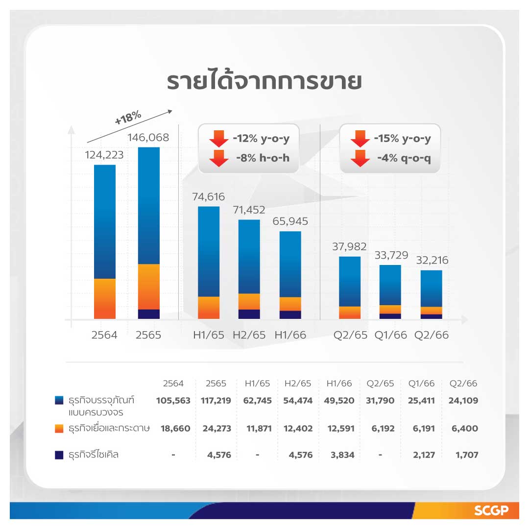 นายวิชาญ จิตร์ภักดี ประธานเจ้าหน้าที่บริหาร บริษัทเอสซีจี แพคเกจจิ้ง จำกัด (มหาชน) หรือ SCGP เปิดเผยถึงผลการดำเนินงานไตรมาสที่ 2 ของปี 2566 สามารถทำกำไรเพิ่มขึ้น แม้ยอดขายชะลอตัวจากไตรมาสก่อนหน้า เนื่องจากยอดขายของสายธุรกิจบรรจุภัณฑ์ครบวงจรที่ปรับลดลง โดยมีปัจจัยหลักมาจากการชะลอตัวของตลาดอินโดนีเซียซึ่งมีวันหยุดราชการยาวในไตรมาสที่ผ่านมา โดยมีรายได้จากการขาย 32,216 ล้านบาท ลดลงร้อยละ 4 จากไตรมาสก่อนหน้า EBITDA 4,681 ล้านบาท เพิ่มขึ้นร้อยละ 5 จากไตรมาสก่อนหน้า และมีกำไรสำหรับงวด 1,485 ล้านบาท เพิ่มขึ้นร้อยละ 22 จากไตรมาสก่อนหน้า