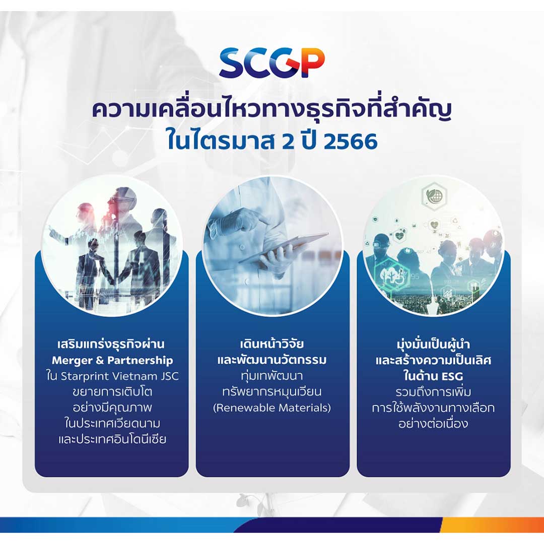 บริษัทฯ ได้มุ่งรักษาการเติบโตอย่างมีคุณภาพ ด้วยการเดินหน้าตามกลยุทธ์การขยายธุรกิจบรรจุภัณฑ์ สำหรับสินค้าอุปโภคบริโภคในอาเซียน ซึ่งเป็นกลุ่มที่ยังมีผลการดำเนินงานที่ดีและเป็นกลยุทธ์ที่สร้างการเติบโตและความแข็งแกร่งให้กับ SCGP โดยเฉพาะในประเทศเวียดนามและประเทศอินโดนีเซีย ซึ่งมีศักยภาพเติบโตสูง โดยได้เตรียมเข้าลงทุนใน Starprint Vietnam JSC (SPV) ประเทศเวียดนาม คาดว่าจะเสร็จสิ้นในปลายไตรมาสที่ 3 ของปี 2566 เพื่อรองรับการอุปโภคบริโภคสินค้าบรรจุภัณฑ์กระดาษที่เพิ่มขึ้นอย่างต่อเนื่องในประเทศเวียดนาม เสริมความครบวงจรและการผนึกกำลังร่วมกันระหว่างบริษัทย่อยอื่น ๆ ในประเทศเวียดนามของ SCGP