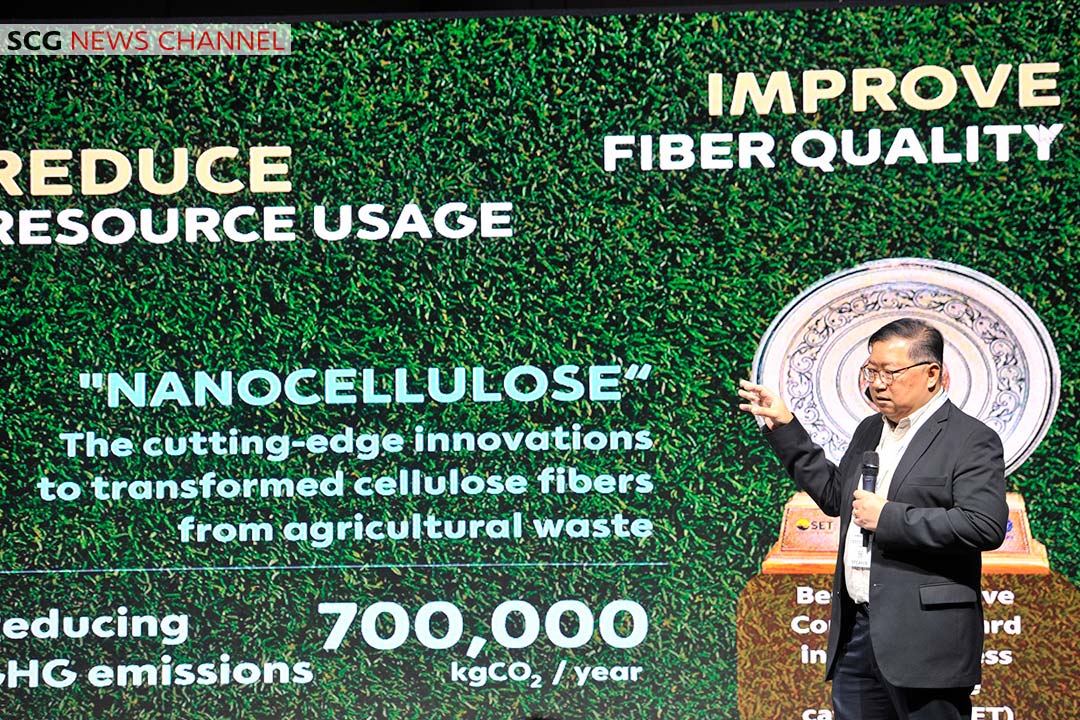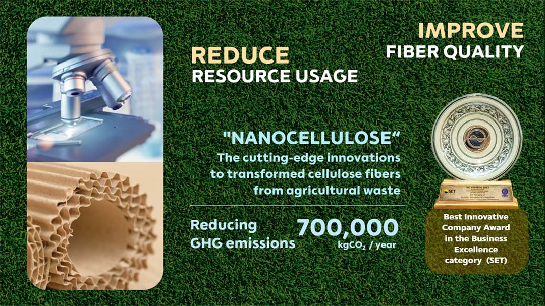 นอกจากนี้ SCGP ได้ศึกษาและพัฒนานวัตกรรม “เส้นใยนาโนเซลลูโลส” จากวัตถุดิบเหลือใช้ทางการเกษตร เพื่อน้ำไปใช้เป็นวัตถุดิบในกระบวนการผลิตกระดาษบรรจุภัณฑ์ ซึ่งได้มีการจดสิทธิบัตรเป็นที่เรียบร้อยแล้ว ทั้งในประเทศและต่างประเทศ