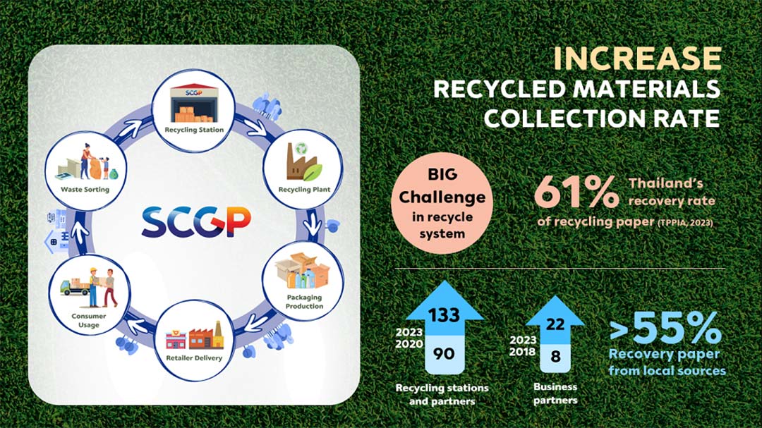 SCGP เดินหน้าสร้างเครือข่ายและความร่วมมือในการใช้ทรัพยากรให้เกิดประโยชน์สูงสุด แบ่งเป็นการเพิ่มพันธมิตรรีไซเคิล จาก 8 รายเป็น 22 ราย การเพิ่มเครือข่ายระบบการจัดเก็บบรรจุภัณฑ์รีไซเคิล หรือ recycling station เพื่อนำบรรจุภัณฑ์เหลือใช้กลับคืนมาที่โรงงาน ซึ่งมีการเพิ่มจากจำนวน 90 แห่งในปี 2563 เพิ่มเป็น 133 แห่งในปี 2566