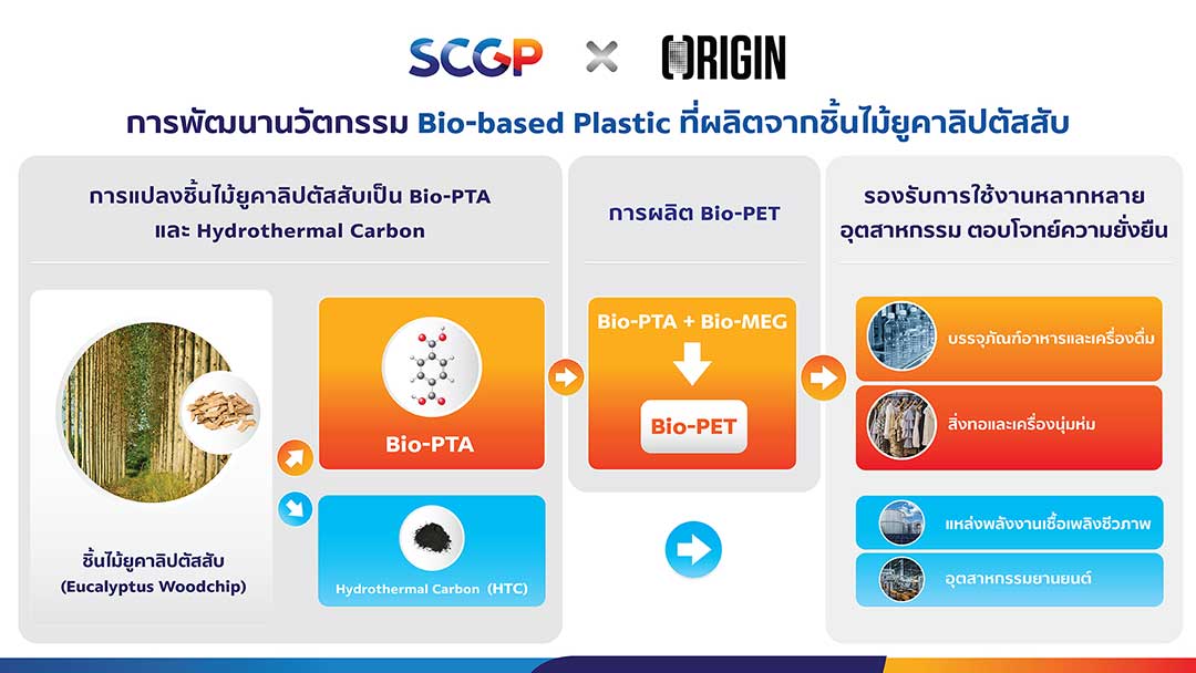ความร่วมมือครั้งนี้เป็นการผนึกกำลังสร้างความร่วมมือทางธุรกิจ ในการผสานความเชี่ยวชาญของทั้ง 2 บริษัท โดย SCGP มีประสบการณ์และความเชี่ยวชาญด้านการวิจัยและพัฒนาไม้ยูคาลิปตัส และสร้างนวัตกรรมจากไม้ยูคาลิปตัสอย่างต่อเนื่อง เพื่อการใช้ทรัพยากรธรรมชาติให้เกิดประโยชน์สูงสุด ขณะที่ Origin Materials เป็นบริษัทระดับโลกที่มีความเชี่ยวชาญด้านการพัฒนาเทคโนโลยี ที่ช่วยลดการปล่อยก๊าซคาร์บอนไดออกไซด์ จึงได้ร่วมทำการทดลองโดยนำชิ้นไม้ยูคาลิปตัสสับ มาผ่านกระบวนการทางเคมี ร่วมกับตัวเร่งปฏิกิริยา ซึ่งเป็นเทคโนโลยีเฉพาะที่มีประสิทธิภาพจนได้ Bio-PTA และ HTC (“Hydrothermal carbon”) โดย Bio-PTA สามารถนำไปผลิตเป็น Bio-PET ซึ่งมีคุณสมบัติเทียบเท่ากับ PET ที่ผลิตจากปิโตรเลียม สามารถนำมารีไซเคิลได้ และสามารถรีไซเคิลพร้อมกับ PET ทั่วไป ในขณะที่ HTC สามารถนำไปผลิตเป็นพลังงานเชื้อเพลิงชีวภาพ และใช้ในอุตสาหกรรมยานยนต์