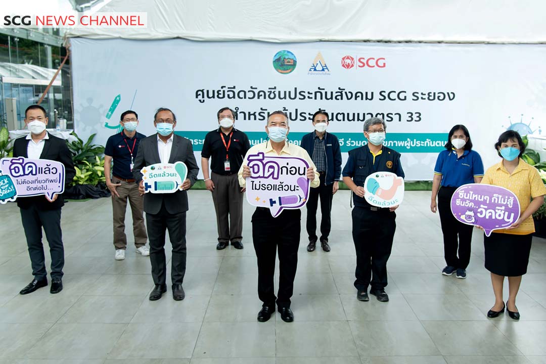 สำนักงานประกันสังคม (สปส.) จังหวัดระยอง ร่วมกับ เอสซีจี เคมิคอลส์ จัดตั้ง “ศูนย์ฉีดวัคซีนประกันสังคม SCG ระยอง สำหรับผู้ประกันตนมาตรา 33” ณ อาคารสำนักงานนิคมอุตสาหกรรม อาร์ ไอ แอล ในธุรกิจเคมิคอลส์ เอสซีจี จ.ระยอง โดยได้รับเกียรติจากนายสุรชัย ชัยตระกูลทอง ผู้ช่วยรัฐมนตรีประจำกระทรวงแรงงาน นายชาญนะ เอี่ยมแสง ผู้ว่าราชการจังหวัดระยอง นายอนันต์ นาคนิยม รองผู้ว่าราชการจังหวัดระยอง และนายปรีดา วัชรเธียรสกุล กรรมการผู้จัดการ บริษัทไทยโพลิเอททีลีน จำกัด รวมทั้งผู้มีส่วนเกี่ยวข้องทุกฝ่ายให้เกียรติเข้าเยี่ยมชมการดำเนินงานของศูนย์ฯ ทั้งนี้ ได้จัดเตรียมสถานที่ รวมถึงสิ่งอำนวยความสะดวกต่าง ๆ ให้กับบุคลากรทางการแพทย์ และผู้ประกันตนที่เข้ารับการฉีดวัคซีน ตั้งแต่วันที่ 8 กรกฎาคม ถึงวันที่ 18 สิงหาคม 2564 เป็นระยะเวลา 42 วัน ซึ่งสนับสนุนนโยบายของสำนักงานประกันสังคมที่มีแผนกระจายวัคซีนให้กับผู้ประกันตนมาตรา 33 ใน 4 จังหวัดเศรษฐกิจ ได้แก่ ระยอง ชลบุรี ฉะเชิงเทรา และสมุทรปราการ หลังจากฉีดวัคซีนให้ผู้ประกันตนฯ ในพื้นที่สีแดงเข้มไปแล้วกว่า 4 แสนคน และจะทำการกระจายวัคซีนในจังหวัดอื่น ๆ ทั่วประเทศต่อไป
