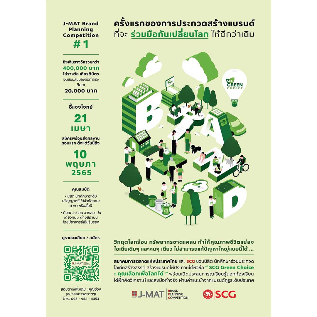 “สมาคมการตลาดแห่งประเทศไทย” ร่วมกับ “เอสซีจี เปิดเวทีให้นิสิต นักศึกษามาปล่อยของ ใน JMAT Brand Planning Competition ครั้งที่ 1 ครั้งแรกของประเทศ กับการประกวดไอเดียปั้นแบรนด์ที่ชวนคนมาร่วมรักษ์โลกSCG Green Choice : คุณเลือกเพื่อโลกได้ ให้น้องๆ ได้ร่วมเรียนรู้ เปิดประสบการณ์นอกห้องเรียน และลงมือทำจริง พร้อมรับคำแนะนำจากแบรนด์กูรูระดับประเทศ ชิงเงินรางวัลและเงินสนับสนุนรวมกว่า 400,000 บาท พร้อมโล่รางวัลและ เกียรติบัตร