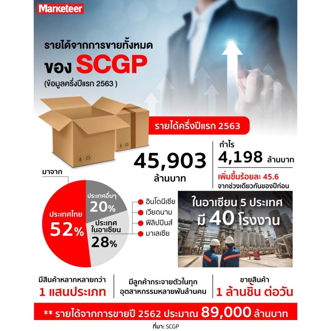 จาก “เอสซีจี เปเปอร์” กลายเป็น “เอสซีจี แพคเกจจิ้ง” ที่ไม่ได้มีแต่กระดาษอย่างเดียวอีกต่อไป แต่มีผลิตภัณฑ์มากมายตามไลฟ์สไตล์ของผู้บริโภคที่หลากหลายถึง 1.2 แสนรูปแบบ (SKUs) มีการปรับโมเดลธุรกิจจากอุตสาหกรรมการผลิตสู่การเป็น Packaging Solutions Provider โดยมีรูปแบบการดำเนินธุรกิจทั้งแบบ B2B, B2B2C และ B2C พร้อม ๆ กับการขยายบิสซิเนสโมเดลนี้ไปยังประเทศต่าง ๆ ในอาเซียน และการตั้งเป้าหมายเป็น “ผู้นำด้านบรรจุภัณฑ์แบบครบวงจรในภูมิภาคอาเซียน” ปัจจุบัน SCGP มีส่วนแบ่งการขายในอาเซียน 36% (จากข้อมูลของฟรอส์ท แอนด์ ซัลลิวัน ส.ค. 63)