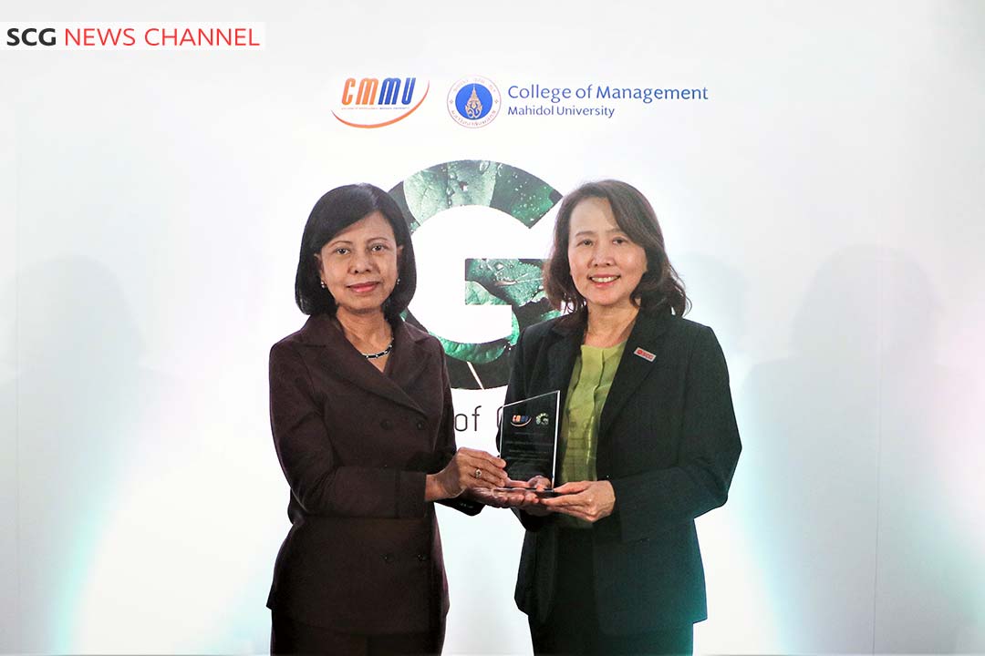 เอสซีจี โดย นางวีนัส อัศวสิทธิถาวร (ขวา) ผู้อำนวยการ Enterprise Brand Management Office รับรางวัล “Top Green Brand Love” แบรนด์ที่ได้รับความนิยมสูงสุดในฐานะองค์กรที่ดำเนินธุรกิจโดยให้ความสำคัญกับคุณค่าของสังคมและสิ่งแวดล้อม จาก ผศ. ดร. ดวงพร อาภาศิลป์ (ซ้าย) คณบดีวิทยาลัยการจัดการ มหาวิทยาลัยมหิดล (CMMU) ซึ่งรางวัลดังกล่าวมาจากการสำรวจความคิดเห็นของกลุ่มผู้บริโภคกว่า 1,300 คน ด้านการรักษาสิ่งแวดล้อมของภาคธุรกิจไทย จัดขึ้นโดยวิทยาลัยการจัดการ มหาวิทยาลัยมหิดล นอกจากนี้ ผลการวิจัยยังแสดงให้เห็นว่า องค์กรธุรกิจมีส่วนสำคัญในการขับเคลื่อนนโยบายสิ่งแวดล้อม รวมถึงกระตุ้นให้ผู้บริโภคใส่ใจและรักสิ่งแวดล้อม